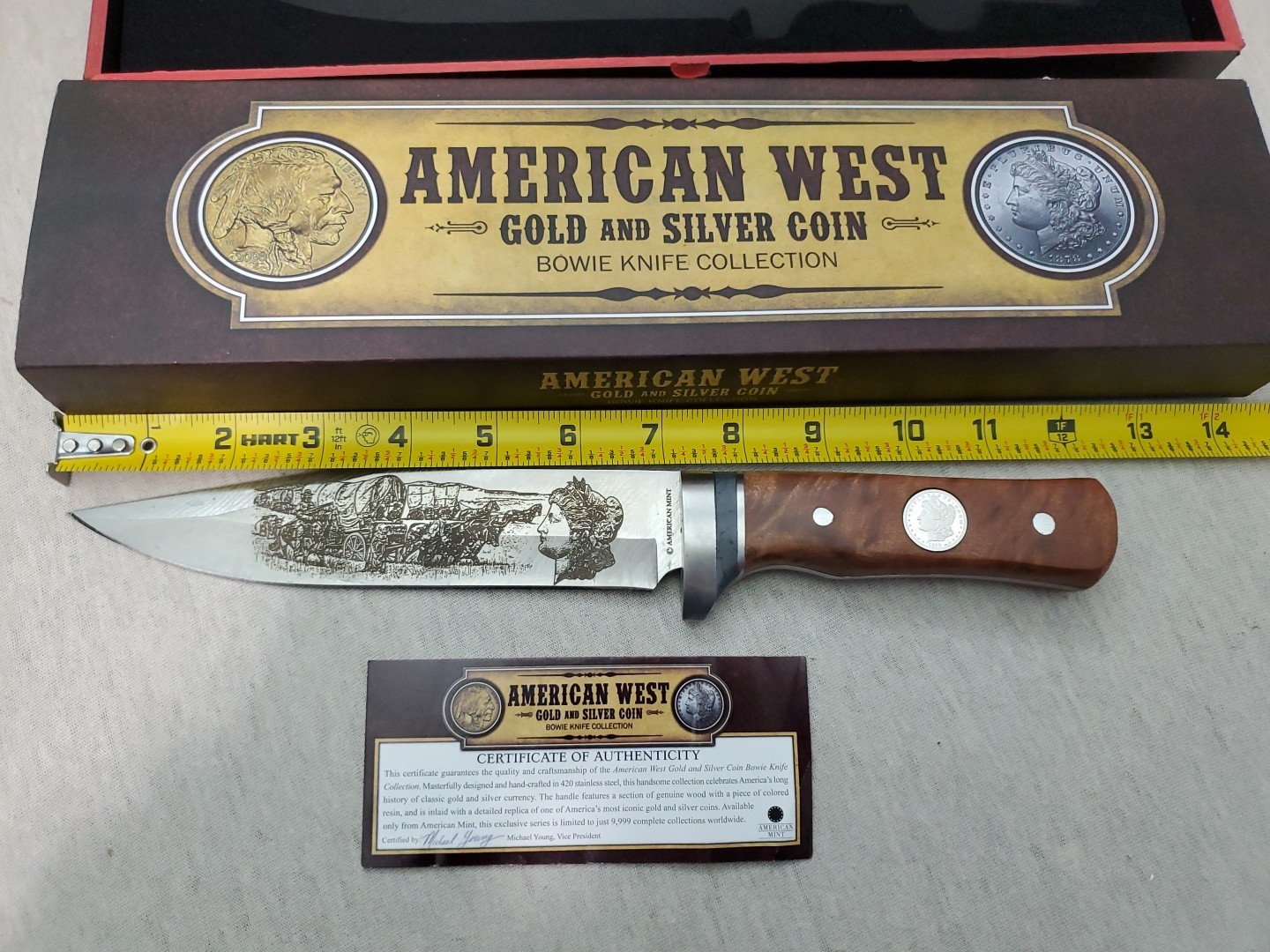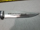 American West gold and silver coin Bowie knife collection this is the Morgan silver dollar version. There is a few spots of tape residue on the blade as shown in the pictures, otherwise great condition.