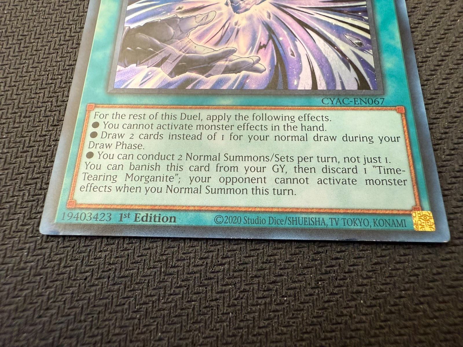 Additional Description:Time-Tearing MorganiteRarity:Super Rarebrand:KonamiSet:Cyberstorm AccessCard Name:Time-Tearing MorganiteCard Number:CYAC-EN067Attribute/MTG:Color:SpellLanguage:EnglishCard Text:For the rest of this Duel, apply the following effects.