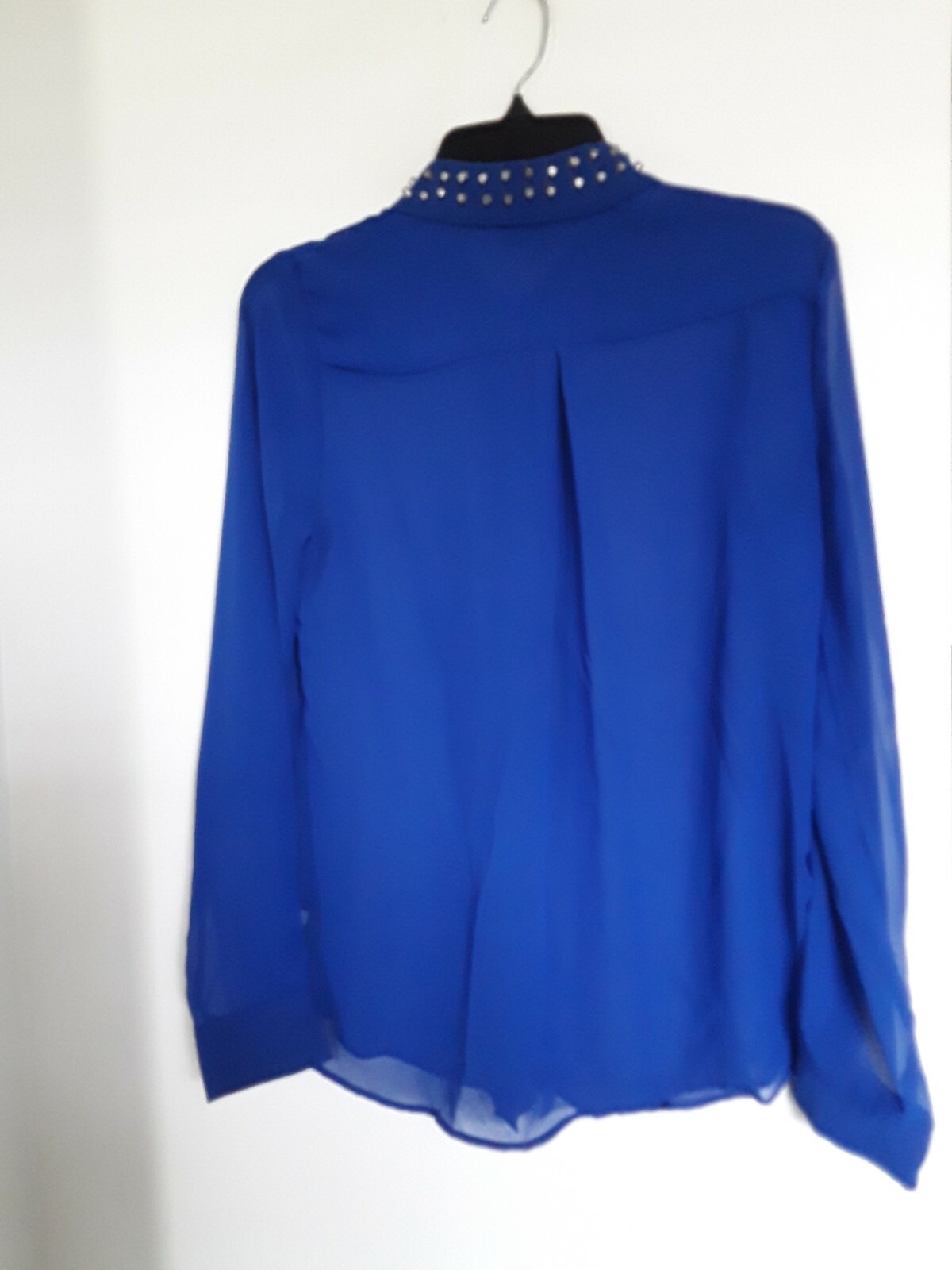 Mossimo Womens M Shirt Royal Blue Blouse Collar Studs Sheer Armpit-armpit: 20" Sleeve Length 25" Length: 26" AT Combined Shipment: USA : Highest item shipping cost + $3.00. for each subsequent item.Or, you can purchase as many items as you choose and pay the flat rate of $ for your Priority Mail Large Flat Rate Box which covers your entire order. Please read the disclaimer below. INTERNATIONAL SHIPMENTS: Highest item shipping cost {+ Item weight.} for each subsequent item. Please read the disclaimer below. DISCLAIMER on Shipping Costs: Our intention is to keep our shipping costs as low as possible. However, depending on the item purchased (weight) and the destination, shipping rates can vary; especially 30 Day?s No Questions Asked Returns Policy: Your satisfaction is very important to us. We have a 30 days NO QUESTIONS ASKED returns policy. The item must be returned in the condition in which it was purchased. If there are labels/tags they should not be removed. If they are, the item will be sent back to you. ANY SHIPPING COSTS WILL NOT BE REFUNDED. BOTH WAYS, receiving and any returns. Please contact us for the return shipping address and authorization. ALL COMMUNICATIONS MUST BE IN WRITING & TAKE PLACE THROUGH THE EBAY SITE ONLY. No private direct email correspondence. A customer care rep. will respond to you within 24 hrs (Mon-Fri). Once we have received the merchandise and inspected it, please allow 72 hours for a refund to be issued. NO See my other listings for more great items! We accept PAYPAL. Also we have a virtual terminal with PayPal through which we can accept Visa, MasterCard, Amex, and Discover. If you do not have a PayPal account, it takes virtually minutes to open International shipments: PLEASE DO NOT PAY until we determine your shipping costs. Most of our items also have an International Flat-Rate. Although, if due to the destination or the weight we are unable to honor the rate mentioned in the item?s listing, we will cancel your order and leave you positive feedback. Usually we use the US Postal Service. The best international rate for an international shipment is First Class (up to 4 lbs.)If your items exceed 4 lbs. we may pack them into two separate packages (and notify you of this).You still are eligible to take advantage of the combined shipping rates, even if we have packed them into two separate packages. The fees for packaging, shipping, insurance, Customs Duty Charges on international shipments are all the responsibility of the Buyer and are not included in the purchase price. If the item(s) are gifts, we could indicate ?GIFT? on the customs form so you would avoid paying more on duty.