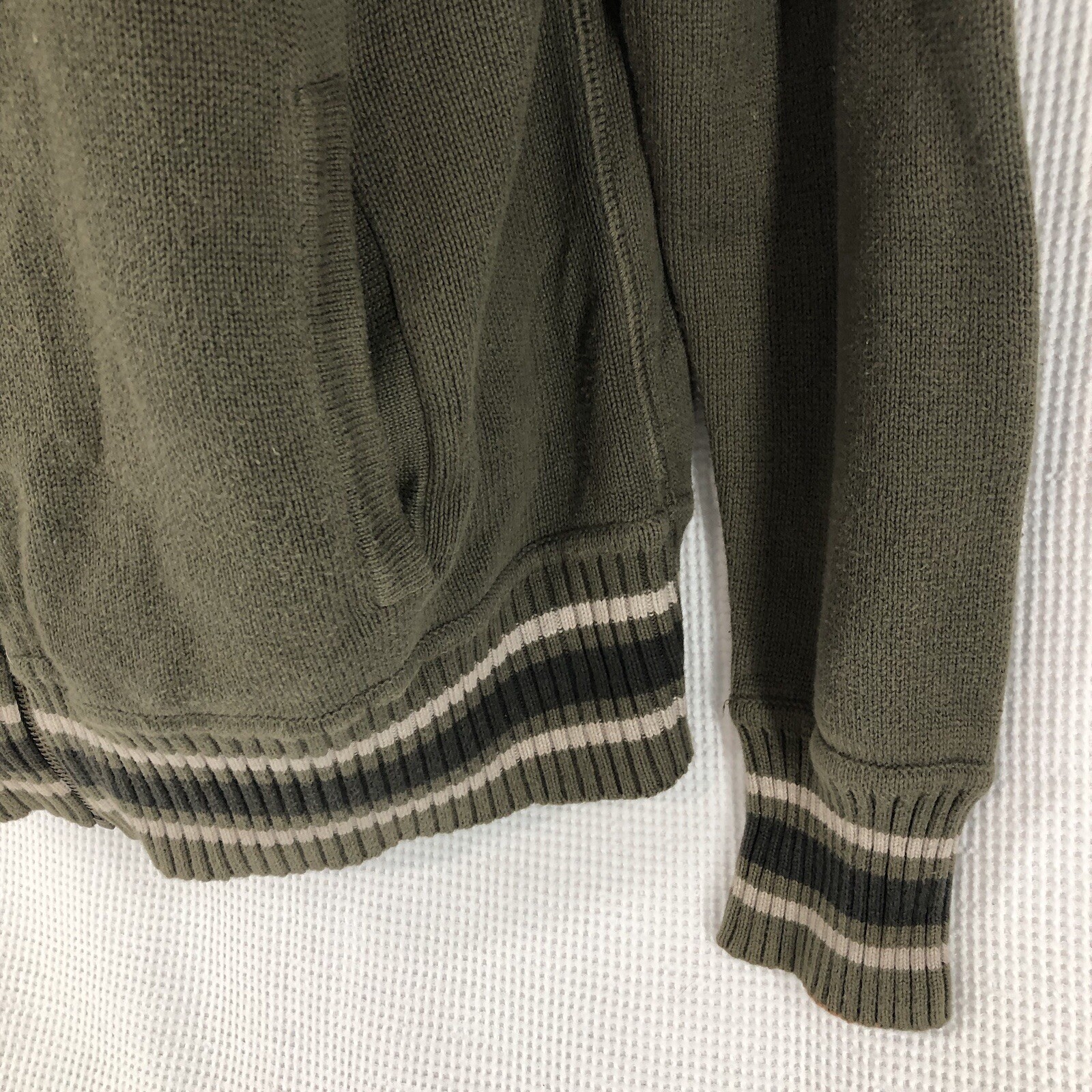 The Mossimo cardigan sweater for women in army green is a vintage piece from the 90s, featuring a full zip and ribbed hems as accents. Made of cotton with a tight-knit fabric type, this sweater has a mock neck and long sleeves with raglan sleeves. Perfect for travel, casual wear, or workwear, this regular fit sweater is suitable for the winter, fall, and spring seasons. The classic army theme adds a stylish touch to the solid green color, making it a versatile and timeless addition to any wardrobe.
