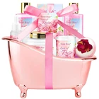 Rose Scent Spa Gift Basket Scent, 9pcs. 9pcs Bath Set for Women Gift: This relaxing women gifts includes: Shower Gel, Shampoo, Body Lotion, Spa Soy Candle, Bath Salt, Jojoba Body Oil, Bath Puff and Dried Flower's Bath Bomb, Bath Puff arranged in a reusable bath tub for attractive storage and display. Bath tub spa kit helps you at home spa Charming Rose Scent: 100% natural Organics Rose Essential Oil & Jojoba Oil can help moisturize and soothe the skin. When used with fresh aroma of Rose, its special and clean fragrance will be sure to give you the much needed relaxation you've been yearning for! Clean and Moisturize: We use safe, natural ingredients like Rose Oil and Jojoba Seed Oil for our spa gift basket. We add moisturizing Shea Butter and nourishing to help make your skin feel smooth and silky Perfect Gifts for Women on All Occasions: Our elegant packaging alone is enough to create an impression on Christmas, Birthdays, Holidays, Mother’s Day, Weddings, Anniversaries & All sorts of occasions. Bring a smile to your Girlfriend, Wife, Mother, Daughter or Beloved Ones Elegant Spa Set for Her: Our Bathtub Bath Set will be the perfect gift for holiday, birthday, anniversary,Halloween, Thanksgiving Day,Christmas, for your lover, friend or yourself