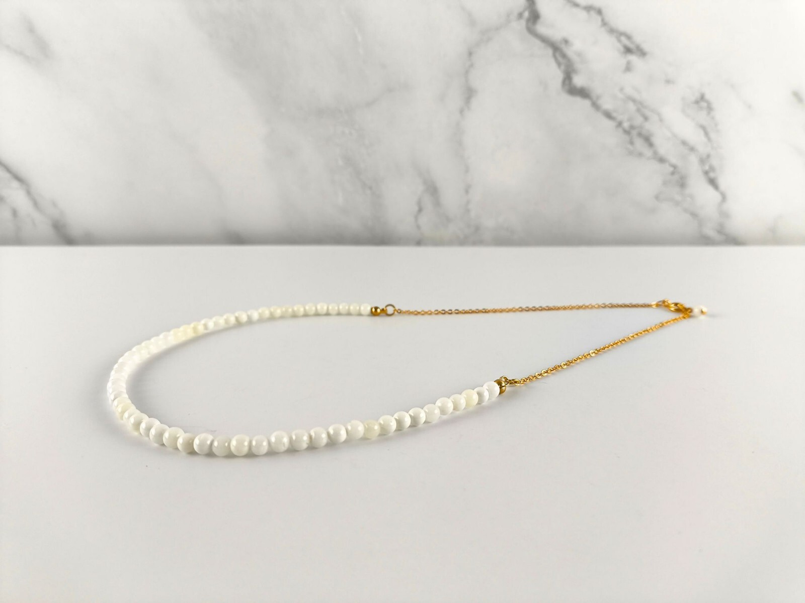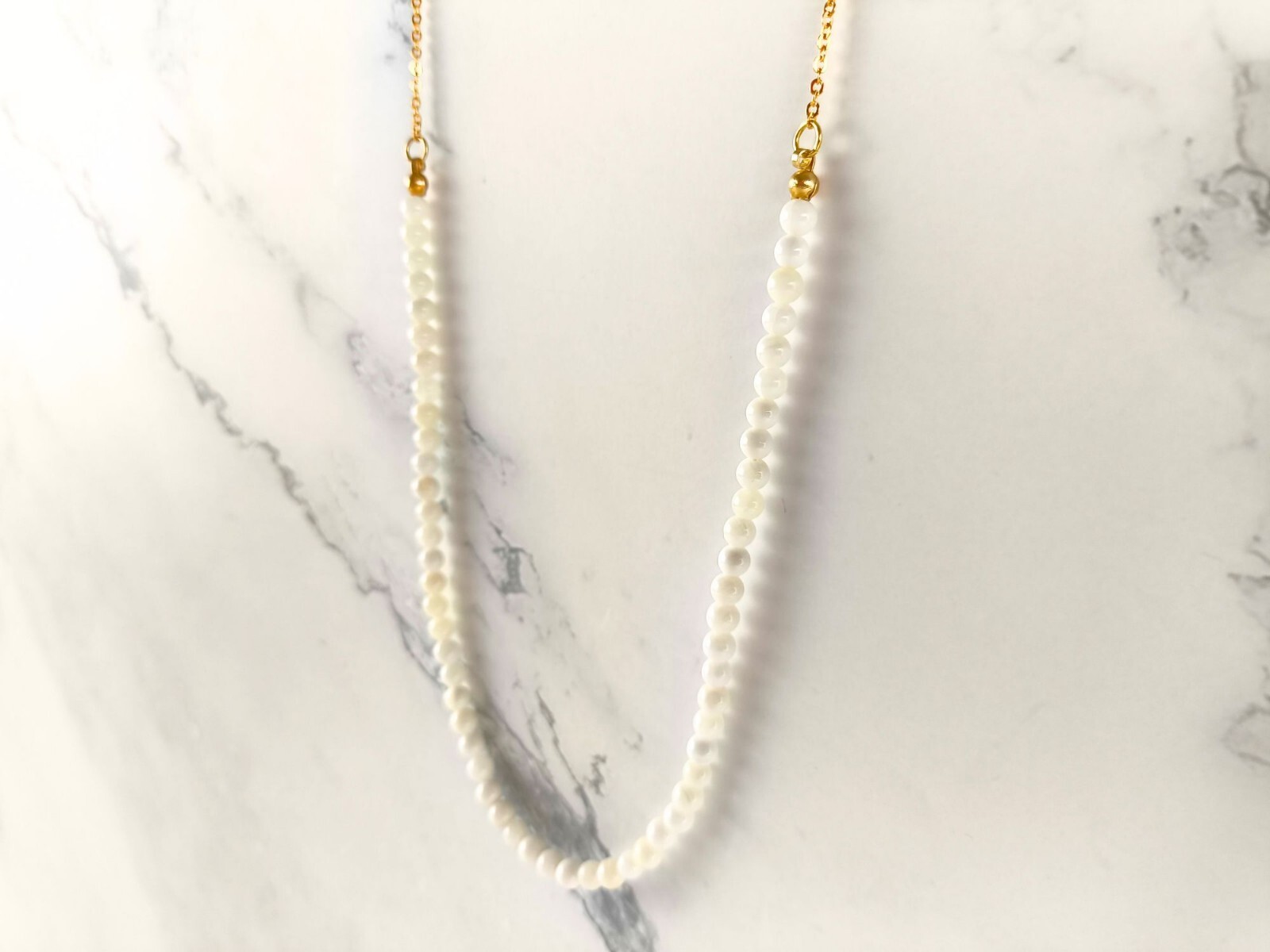 Mother of pearl shell 3mm beads gold plated necklace. New. Comes in a drawstring organza jewellery bag.