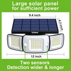 [Wide Arc Lighting Area] The solar flood lights can adjust the 3 lamp heads providing an industry leading 270°Wide angle of illumination. The solar motion light has 3 lighting modes: (1) Mode 1 -Lights set on low brightness setting at all times and will illuminate brightly when motion sensor is activated. (2) Mode 2-lights will be off and will illuminate brightly when motion sensor is activated. (3) Mode 3 -lights will be on low light throughout the night and motion sensor is inactivated. [High-Efficiency Solar Panels & High-Capacity Batteries] intelamp solar security lights use high-power 40 square inch solar panels which charge more efficiently than the majority of products on the market. This allows the high-capacity battery to quickly hold 3 times more charge than other leading manufacturers. From a daylight fully charge the security lamps can last up to 3 nights in sensing mode at an impressive actual brightness of 1200 lumens. [Unique 2 Sensor Design] The innovative dual sensor design detects motion through a much wider range than single sensor models and provides a full 180 degrees of security coverage. This solar security lights enhanced security feature reduces blind spots and offers more light protection throughout the night. 【Easy Installation】Each package is equipped with screws and tie straps for you to install the solar flood lights outdoor where you need them most. The solar sensor lights can be screwed to all hard surfaces such as walls, wooden fences and garage door frames or bound to trees or posts with the tie straps provided. 【Two Years of Service Life for the Solar Light】 As a professional solar lighting producer intelamp stands by this solar motion sensor light. With a comprehensive installation manual and impressive after sales service team customer satisfaction is guaranteed. Product Description 1 MODE 1 2 MODE 2 3 MODE 3 1 Scenario 2 Scenario 3 Scenario 4 Scenario The video showcases the product in use. The video guides you through product setup. The video compares multiple products. The video shows the product being unpacked.