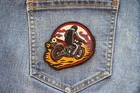 3x2.7 inch. Embroidered Patch with Plastic Iron on Backing. Patch can be sewn on to Leather Vests, Jackets or Chaps. Patch can also be ironed on to Denim Shirts, Hats or Bags. Iron on Patch at 280 Degrees Fahrenheit for 30 Seconds. Ironing on Application is a semi permanent way of attaching patches. Sew on the Patch for Permanent application. Do not iron on patches to Leather or Nylon Materials.