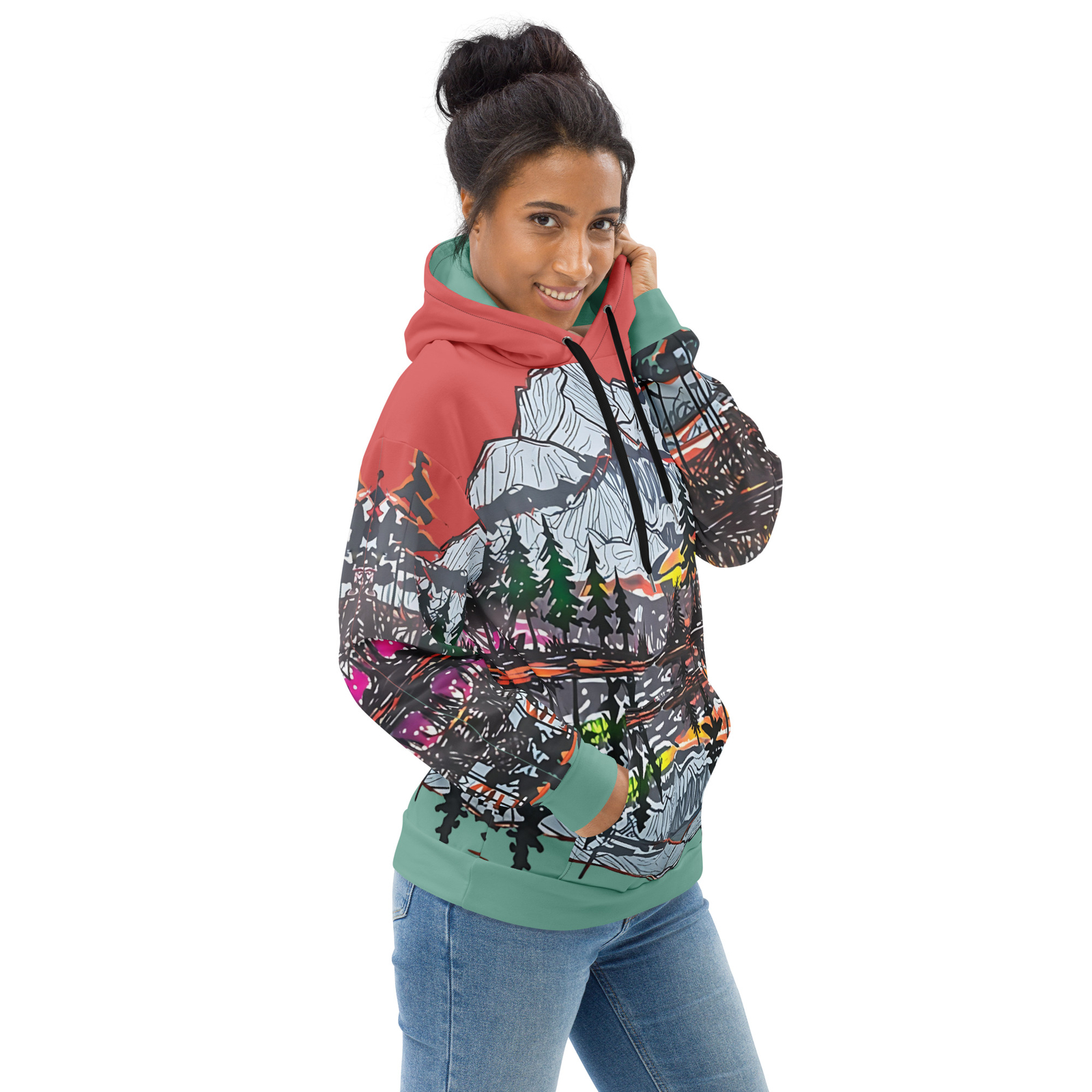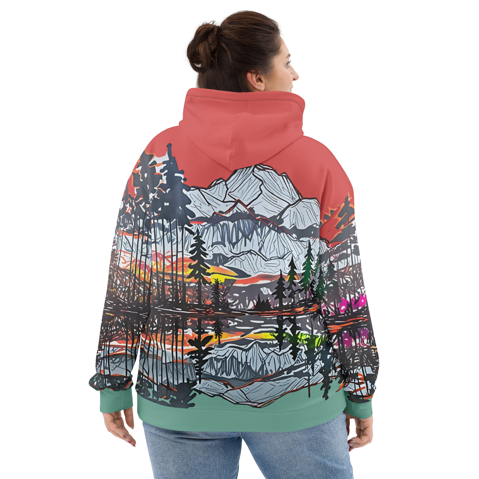 Capture the beauty of nature with this stunning all-over print hoodie! Featuring an artistic mountain landscape design with a vibrant sunset, this hoodie is perfect for outdoor enthusiasts, art lovers, or anyone looking to elevate their casual wardrobe. Made from a soft, lightweight fabric, it ensures maximum comfort and durability. The unisex fit and bold colors make it a versatile piece for both men and women. Perfect for cozy nights, hikes, or everyday wear, this hoodie combines style and functionality seamlessly. This comfy unisex hoodie has a soft outside with a vibrant print and an even softer brushed fleece inside. The hoodie has a relaxed fit, and it’s perfect for wrapping yourself into on a chilly evening. • 95% recycled polyester, 5% spandex • Fabric weight (may vary by 5%): 9.08 oz./yd.² (308 g/m²) • Soft cotton-feel fabric face • Brushed fleece fabric inside • Double-lined hood with design on both sides • Unisex style • Comes with drawstrings • Overlock seams Mountain hoodie, graphic hoodie, all-over print hoodie, sunset hoodie, men’s hoodie, unisex pullover, casual hoodie, hiking hoodie, nature graphic, artistic hoodie This product is made especially for you as soon as you place an order, which is why it takes us a bit longer to deliver it to you. Making products on demand instead of in bulk helps reduce overproduction, so thank you for making thoughtful purchasing decisions! Size guide CHEST (inches) WAIST (inches) HIPS (inches) XS 36 ¼ 29 ⅞ 37 S 37 ¾ 31 ½ 38 ⅝ M 39 ⅜ 33 ⅛ 40 ⅛ L 42 ½ 36 ¼ 43 ¼ XL 45 ⅝ 39 ⅜ 46 ½ 2XL 48 ⅞ 42 ½ 49 ⅝ 3XL 52 45 ⅝ 52 ¾ 4XL 55 ⅛ 48 ⅞ 55 ⅞ 5XL 58 ¼ 52 59 6XL 61 ⅜ 55 ⅛ 62 ¼