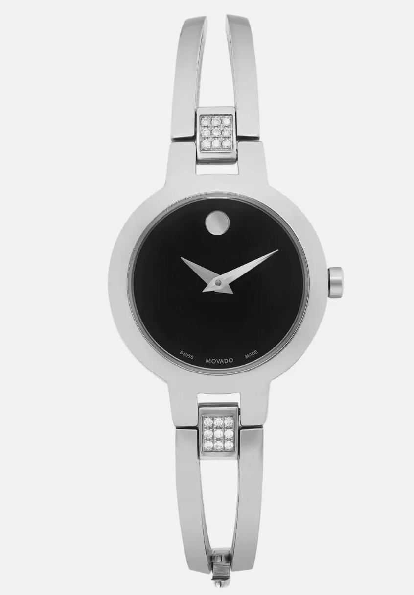 RACCOON STASH NYC WELCOMES YOU! 100% Money Back Guarantee! New Authentic Movado Amorosa 0607154 Woman's Black Museum Dial Stainless Steel Swiss Bangle Watch New without tags - Storefront Display in Excellent New Condition Movado Box & Paperwork not included! Swiss Made | 24mm | Polished Stainless Steel Brand Movado Model 0607154 Movement Swiss Quartz Case Material Stainless Steel Case Size 24 mm Crystal Flat Edge-to-Edge Dark Metalized Sapphire Dial Silver Hands Bracelet Polished Stainless Steel Water Resistance 30m (3 Bar) Condition Disclosure: The watch is a storefront display in excellent new condition, never used / worn. Comes with retail tag. Excellent condition: there are a few hairline contact marks on bracelet, otherwise no defects, wear or damage on case, bracelet or crystal. No original gift box or paperwork included. Includes a complimentary generic watch box. Bracelet length fits approx. 7" wrist. Original battery in working condition. Shipping & International Buyers: All items are carefully packaged to prevent damage during transit. International Buyers: Import duties, taxes, and charges are not included in the item price or shipping cost. Please check with your country’s customs office for additional costs before purchase. If you have any questions, feel free to ask. Thank you for choosing us! RV 4W_004