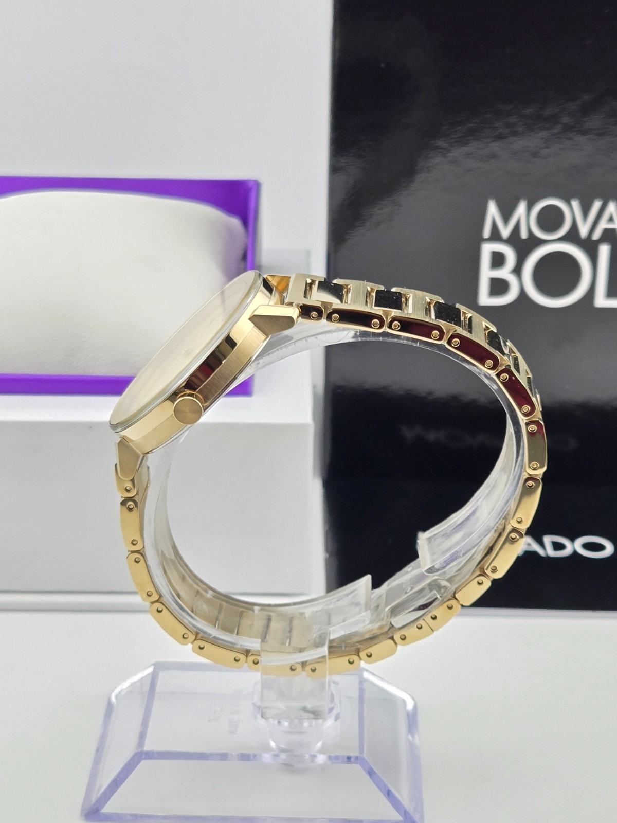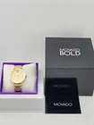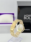 Movado Bold Evolution Women's Gold Glitter Dial Watch - 3600733 ($850 MSRP) With Original Box! This watch is a Shelf Pull from one of the Major Department Stores. Watch has scratches on the watch case/band. The Movado Bold Evolution Women's Gold-Tone Glitter Dial Watch (Model: 3600733) is a stunning timepiece that effortlessly combines elegance with modern flair. Featuring a pale yellow gold-tone stainless steel case and bracelet, this watch makes a bold statement with its sleek, contemporary design. The fixed stainless steel bezel adds a touch of sophistication, complementing the watch's shimmering pale yellow gold-tone glitter dial. The dial is adorned with matching gold-tone hands, creating a cohesive and luxurious appearance that will surely turn heads. Designed for both style and functionality, the Movado Bold Evolution watch features precise analog timekeeping powered by a reliable quartz movement. The 34mm round case size is both refined and versatile, making it suitable for a variety of occasions, from formal gatherings to casual outings. The watch's scratch-resistant K1 crystal ensures durability, maintaining its pristine look for years to come. A pull/push crown adds to the watch's seamless design, enhancing both comfort and ease of use. With its timeless appeal and high-quality craftsmanship, the Movado Bold Evolution Women's Gold-Tone Glitter Dial Watch is the perfect accessory for any woman who appreciates a sophisticated yet modern style. Its subtle yet radiant gold-tone accents and versatile design make it a must-have for those who want a statement piece that transcends trends. Whether worn daily or for special occasions, this watch is sure to complement your wardrobe while offering reliable performance and lasting beauty. Features Pale yellow gold-tone stainless steel case and bracelet. Fixed stainless steel bezel. Pale yellow gold-tone glitter dial with pale yellow gold-tone hands. Dial Type: Analog. Quartz movement. Scratch resistant K1 crystal crystal. Pull / push crown. Solid case back. Round case shape, case size: 34 mm. Functions: hour, minute. Bold Evolution Series. Dress watch style. Watch label: Swiss Made. Fast and Free Shipping You're already purchasing the item. Why pay additional for shipping, especially slow shipping? We get your order shipped out within 1-business day and delivered to your doorstep as quickly as possible. Competitive Pricing With our dynamic pricing model, our prices are always competitive. Our prices are some of the lowest that you will find on the internet. Rest assured that you're getting a good deal when purchasing with us. 30-day Money Back Guarantee We are committed to making sure that you leave this transaction satisfied. If you're unhappy with the product for any reason, you may return it back for your money-back or a replacement within 30 days. No questions asked!