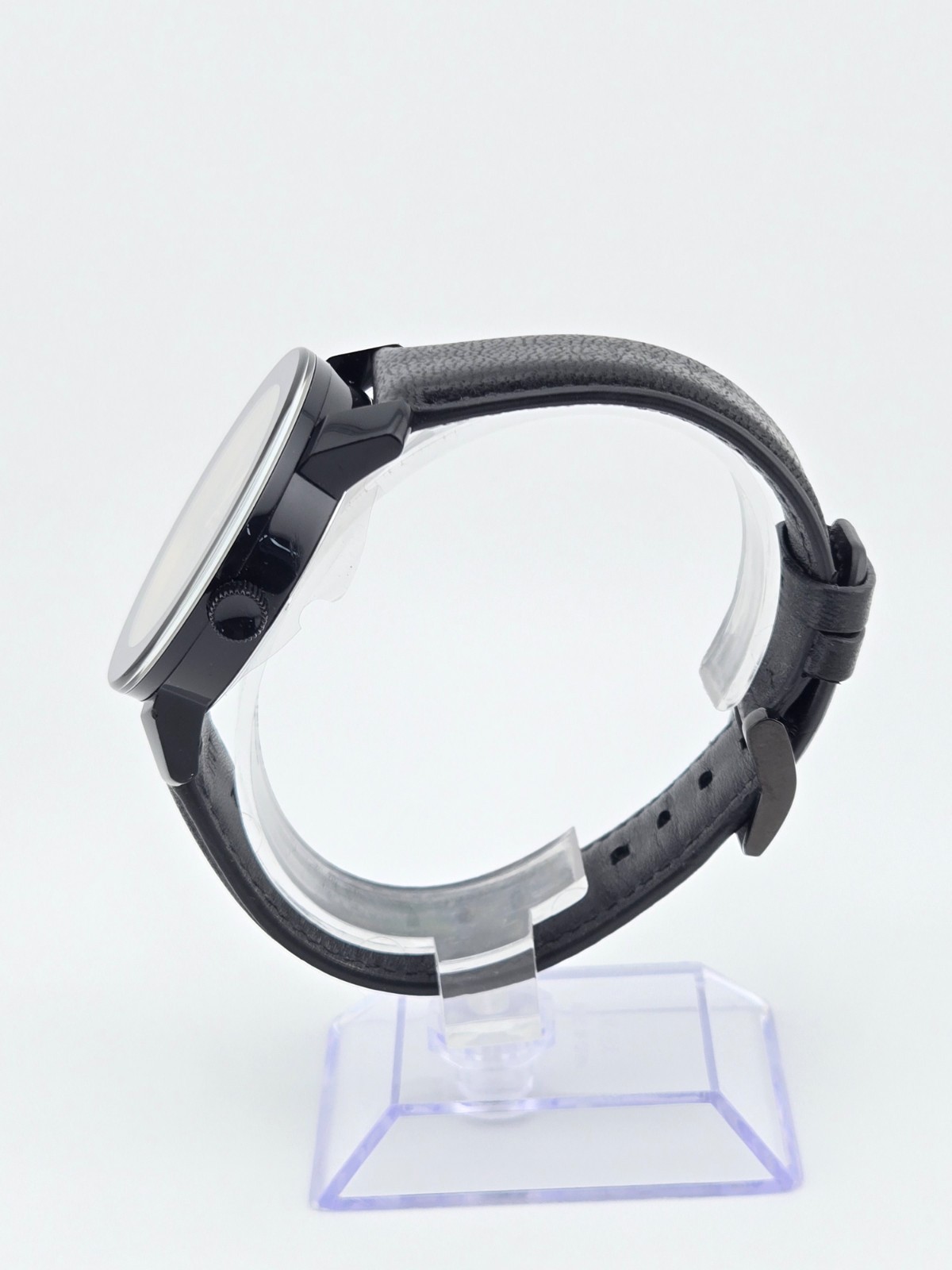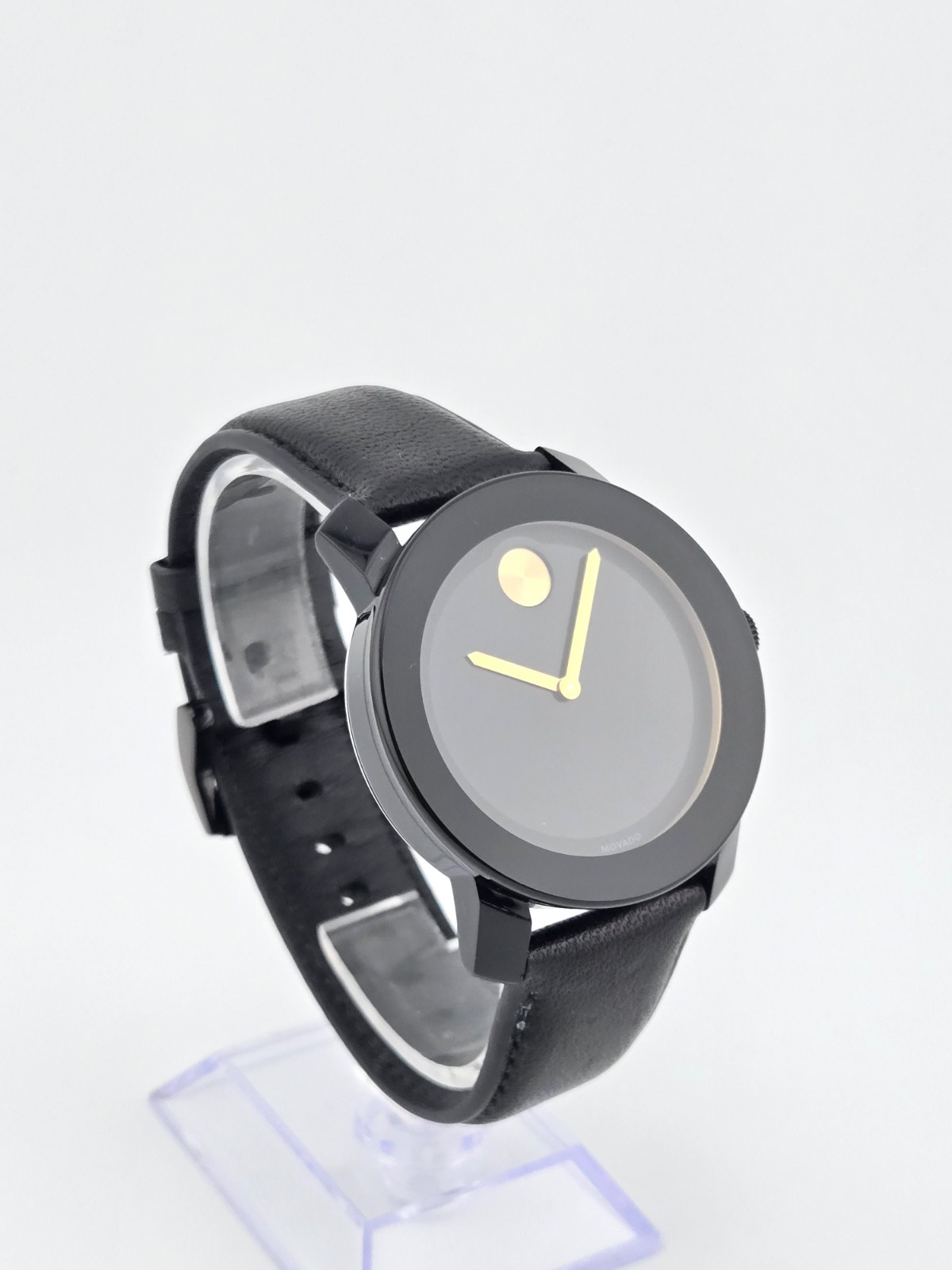 Movado Bold Men's Black Dial Black Leather Band Watch - 3600480 ($395 MSRP) With Original Box! This watch is a Shelf Pull from one of the Major Department Stores. Watch has scratches on the watch case/band . NOTE: There are micro scratches on the dial! Bold and modern, the Movado Bold Men's Black Dial Black Leather Band Watch (3600480) is a striking example of minimalist design and contemporary style. Featuring a sleek black PVD stainless steel case paired with a smooth black leather strap, this timepiece is all about understated luxury. The all-black dial is enhanced with gold-tone hands and the signature Movado dot at 12 o’clock, creating a sharp contrast that commands attention without overwhelming. At 42 mm in diameter and 10 mm thick, the round case offers a strong presence on the wrist while maintaining a clean, streamlined look. The scratch-resistant sapphire crystal protects the dial, and the quartz movement ensures reliable and precise timekeeping. A pull/push crown and solid case back complete the durable design, while the 21 mm leather strap with a classic tang clasp ensures a comfortable and secure fit. Water-resistant up to 30 meters (100 feet), this watch can handle everyday splashes while maintaining its polished appearance. Whether worn with a tailored suit or casual attire, the Movado Bold 3600480 brings together functionality and fashion in a refined, masculine package. It’s the perfect accessory for the modern man who values both style and substance. Features Black PVD stainless steel case with a black leather strap. Fixed black PVD bezel. Black dial with gold-tone hands. No markers. The Movado dot appears atthe 12 o'clock positions. Dial Type: Analog. Quartz movement. Scratch resistant sapphire crystal. Pull / push crown. Solid case back. Round case shape. Case size: 42 mm. Case thickness: 10 mm. Band width: 21 mm. Tang clasp. Water resistant at 30 meters / 100 feet. Functions: hour, minute. Fast and Free Shipping You're already purchasing the item. Why pay additional for shipping, especially slow shipping? We get your order shipped out within 1-business day and delivered to your doorstep as quickly as possible. Competitive Pricing With our dynamic pricing model, our prices are always competitive. Our prices are some of the lowest that you will find on the internet. Rest assured that you're getting a good deal when purchasing with us. 30-day Money Back Guarantee We are committed to making sure that you leave this transaction satisfied. If you're unhappy with the product for any reason, you may return it back for your money-back or a replacement within 30 days. No questions asked!