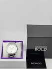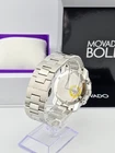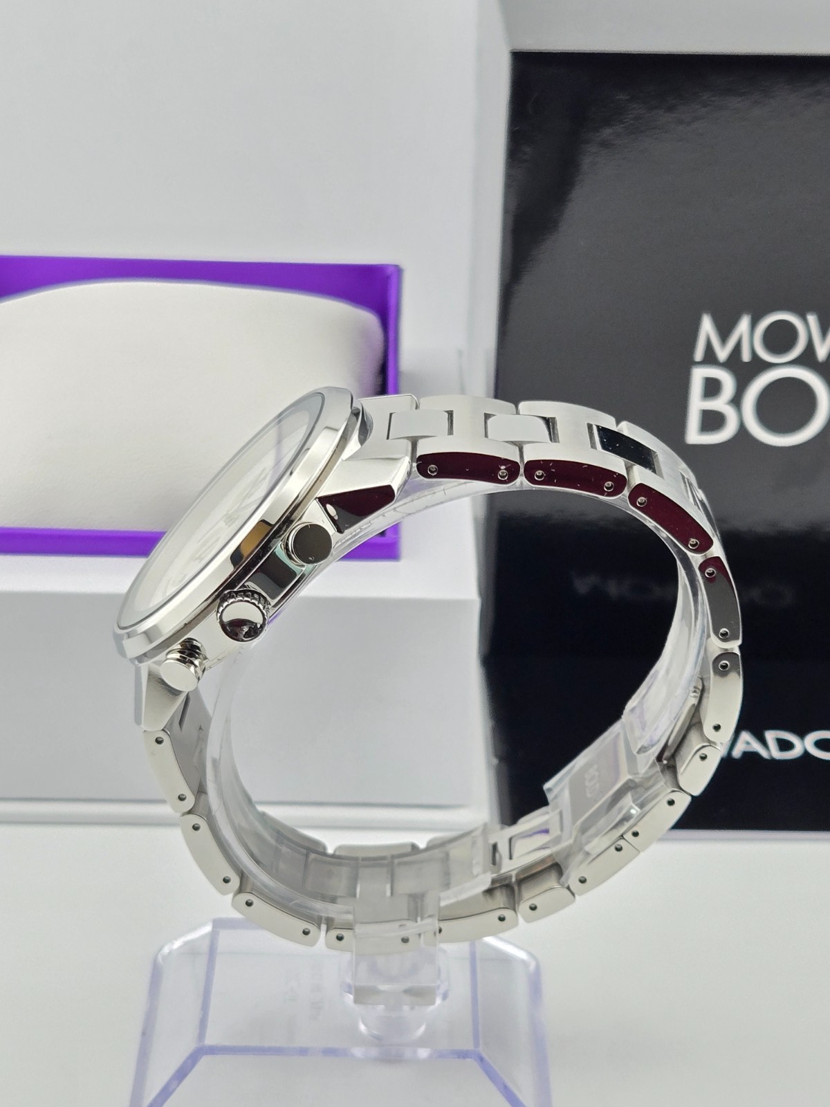 Movado Bold Trend Men’s Silver Dial Stainless Steel Watch - 3600276 ($995 MSRP) With Original Box! This watch is a Shelf Pull from one of the Major Department Stores. Watch has scratches on the watch case/band. Sleek and sophisticated, this men's Movado Bold® watch is an understated choice for day and evening wear. Fashioned in bright stainless steel, this tactical design features a round silver dial with metallic tonal hands and markers, a date display at the six o'clock marker, a silver Movado sunray dot at the 12 o'clock marker, and three chronograph sub-dials. The stylish stainless steel link bracelet secures with a push-button deployment clasp. Ensuring accuracy, the Swiss quartz movement keeps you right on time. Features Stainless steel case with a stainless steel bracelet. Fixed stainless steel bezel. Silver dial with silver-tone hands and index hour markers. Minute markers around the outer rim. The Movado dot marks the 12 o'clock position. Dial Type: Analog. Date display at the 6 o'clock position. Chronograph - three sub-dials displaying: 60 seconds, 30 minute, and 12 hour. Quartz movement. Scratch resistant mineral crystal. Pull / push crown. Solid case back. Case diameter: 44 mm. Round case shape. Deployment clasp. Water resistant at 30 meters / 100 feet. Functions: date, hour, minute, second Fast and Free Shipping You're already purchasing the item. Why pay additional for shipping, especially slow shipping? We get your order shipped out within 1-business day and delivered to your doorstep as quickly as possible. Competitive Pricing With our dynamic pricing model, our prices are always competitive. Our prices are some of the lowest that you will find on the internet. Rest assured that you're getting a good deal when purchasing with us. 30-day Money Back Guarantee We are committed to making sure that you leave this transaction satisfied. If you're unhappy with the product for any reason, you may return it back for your money-back or a replacement within 30 days. No questions asked!