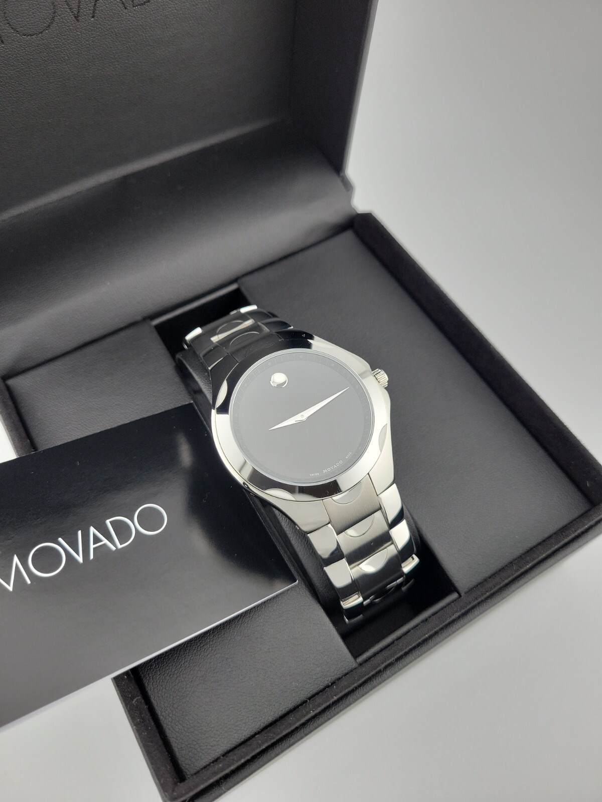 Movado Luno Men’s Museum Black Dial Quartz Watch - 0606378 ($1095 MSRP) With Original Box! This watch is a Shelf Pull from one of the Major Department Stores. Watch has micro scratches on the watch case/band, visible under direct light. The Movado Luno Men’s Museum Black Dial Quartz Watch - 0606378 exemplifies the iconic design philosophy of Movado with its sleek and minimalist aesthetic. Encased in stainless steel, this timepiece features a classic black museum dial adorned with silver-tone hands and dot hour markers, showcasing Movado's distinctive style. The signature Movado dot, positioned at 12 o'clock, adds a touch of sophistication and serves as a hallmark of the brand's design heritage. Powered by quartz movement, the watch offers precise and reliable timekeeping, ideal for daily wear. A scratch-resistant sapphire crystal protects the dial from scratches and ensures clarity. With a case size of 40 mm and a slim profile of just 7 mm thickness, it maintains a refined presence on the wrist. The stainless steel bracelet with a deployment clasp provides both comfort and security, while its water resistance up to 30 meters (100 feet) adds practicality to its elegant design, making it suitable for various occasions from formal to casual settings. The Movado Luno epitomizes timeless style and functionality, making it a versatile addition to any watch collection. Features Stainless steel case with a stainless steel bracelet. Fixed stainless steel bezel. Black museum dial with silver-tone hands and dot hour markers. Minute markers around the outer rim. The signature Movado dot appears at the 12 o'clock position. Dial Type: Analog. Quartz movement. Scratch resistant sapphire crystal. Pull / push crown. Solid case back. Round case shape. Case size: 40 mm. Case thickness: 7 mm. Band width: 23 mm. Band length: 8 inches. Deployment clasp. Water resistant at 30 meters / 100 feet. Functions: hours, minutes. Fast and Free Shipping You're already purchasing the item. Why pay additional for shipping, especially slow shipping? We get your order shipped out within 1-business day and delivered to your doorstep as quickly as possible. Competitive Pricing With our dynamic pricing model, our prices are always competitive. Our prices are some of the lowest that you will find on the internet. Rest assured that you're getting a good deal when purchasing with us. 30-day Money Back Guarantee We are committed to making sure that you leave this transaction satisfied. If you're unhappy with the product for any reason, you may return it back for your money-back or a replacement within 30 days. No questions asked!