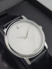 Movado Museum Men's Silver Dial Black Leather Strap Watch - 2100001 ($550 MSRP) New with Original Box and Tags! This watch is a Shelf Pull from one of the Major Department Stores. May find few micro scratches on the watch case/band, visible under a direct and strong light. Classic design meets modern simplicity in the **Movado Museum Men’s Silver Dial Black Leather Strap Watch (Model 2100001)**. This timeless timepiece features a polished stainless steel case paired with a rich black leather strap, creating a striking balance of sleek sophistication and everyday comfort. The iconic silver-toned dial is minimalist by design, with no hour markers—only slim silver-tone hands and the signature Movado dot at 12 o’clock, symbolizing purity in form and function. Sized at 40mm with an 8mm slim profile, this watch offers a clean, contemporary look that complements both professional and casual attire. The scratch-resistant sapphire crystal preserves the dial’s pristine appearance, while the precise quartz movement ensures dependable timekeeping. A solid case back, pull/push crown, and classic tang clasp complete the refined construction, emphasizing quality and durability. Water-resistant up to 30 meters (100 feet), the Movado Museum watch is ideal for everyday wear with protection against splashes and brief immersion. Perfect for the man who values understated elegance and Bauhaus-inspired design, this watch is a standout piece that reflects both tradition and modern style. Features Stainless steel case with a black leather strap. Fixed stainless steel bezel. Silver dial with silver-tone hands. No markers. The Movado dot marks the 12 o'clock position. Dial Type: Analog. Quartz movement. Scratch resistant sapphire crystal. Pull / push crown. Solid case back. Round case shape. Case size: 40 mm. Case thickness: 8 mm. Band width: 21 mm. Tang clasp. Water resistant at 30 meters / 100 feet. Functions: hour, minute. Fast and Free Shipping You're already purchasing the item. Why pay additional for shipping, especially slow shipping? We get your order shipped out within 1-business day and delivered to your doorstep as quickly as possible. Competitive Pricing With our dynamic pricing model, our prices are always competitive. Our prices are some of the lowest that you will find on the internet. Rest assured that you're getting a good deal when purchasing with us. 30-day Money Back Guarantee We are committed to making sure that you leave this transaction satisfied. If you're unhappy with the product for any reason, you may return it back for your money-back or a replacement within 30 days. No questions asked!