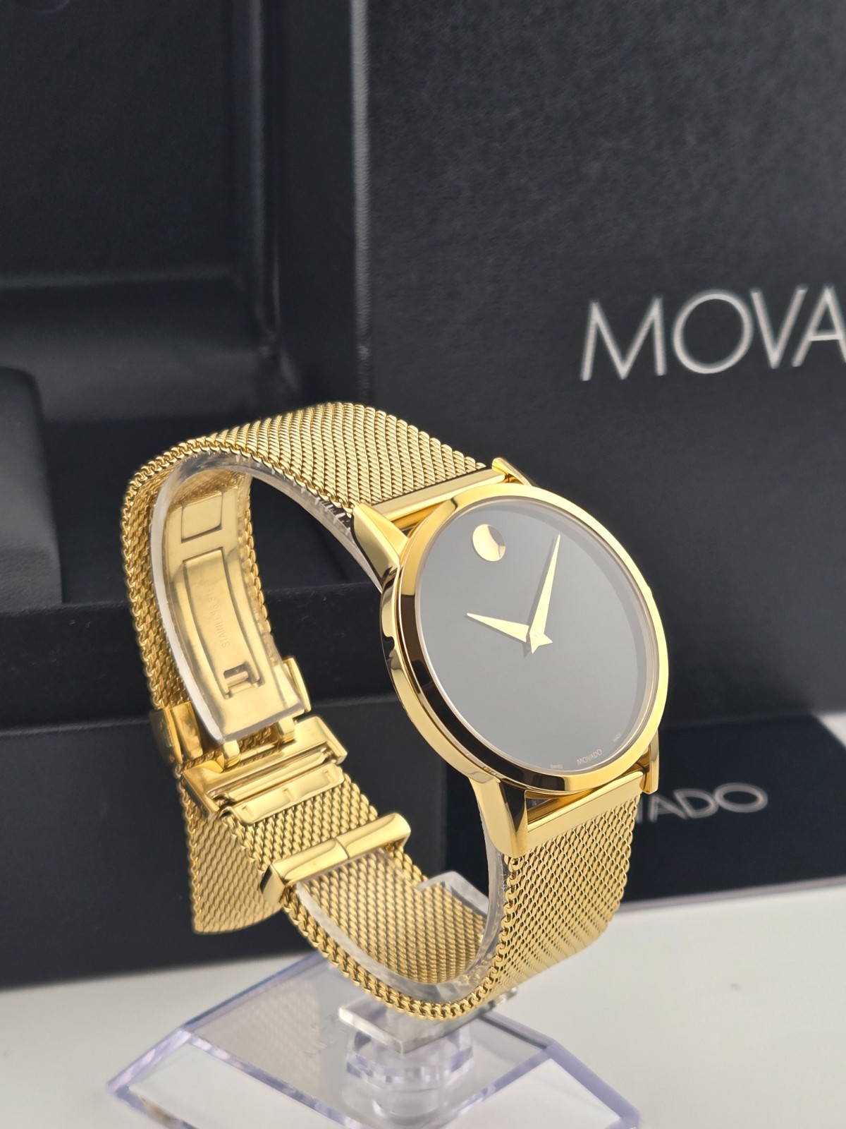 Movado Museum Women's Black Dial Stainless Steel Watch - 0607647 ($995 MSRP) With Original Box! This watch is a Shelf Pull from one of the Major Department Stores. This watch has been professionally refurbished and is in excellent condition with minimal cosmetic imperfections . The **Movado Museum Women's Black Dial Stainless Steel Watch - 0607647** is a refined and minimalist timepiece that captures the essence of Movado’s iconic design. Featuring a 33mm yellow gold-tone stainless steel case and matching bracelet, this watch offers a luxurious, compact silhouette ideal for those who prefer a sleek and understated accessory. The fixed yellow gold-tone bezel frames a deep black dial, elegantly accented with gold-tone hands and the signature Movado dot at 12 o’clock. Powered by a precise quartz movement, this watch provides reliable hour and minute functions, perfect for everyday use or special occasions. The scratch-resistant sapphire crystal protects the dial, ensuring long-lasting clarity and durability. With a pull/push crown and solid case back, the watch is built to maintain its clean, elegant design while offering practical resilience. Secured with a fold-over clasp and safety release, the yellow gold-tone bracelet ensures a comfortable and secure fit. Water-resistant up to 30 meters (100 feet), the **Movado Museum 0607647** is suitable for light water exposure and daily wear. Its classic color combination and timeless design make it a versatile accessory that complements both casual and formal ensembles. Features Yellow gold-tone stainless steel case and bracelet. Fixed yellow gold-tone stainless steel bezel. Black dial with yellow gold-tone hands. Dial Type: Analog. Quartz movement. Scratch resistant sapphire crystal. Pull / push crown. Solid case back. Round case shape, case size: 33 mm. Fold over clasp with a safety release. Water resistant at 30 meters / 100 feet. Functions: hour, minute. Fast and Free Shipping You're already purchasing the item. Why pay additional for shipping, especially slow shipping? We get your order shipped out within 1-business day and delivered to your doorstep as quickly as possible. Competitive Pricing With our dynamic pricing model, our prices are always competitive. Our prices are some of the lowest that you will find on the internet. Rest assured that you're getting a good deal when purchasing with us. 30-day Money Back Guarantee We are committed to making sure that you leave this transaction satisfied. If you're unhappy with the product for any reason, you may return it back for your money-back or a replacement within 30 days. No questions asked!