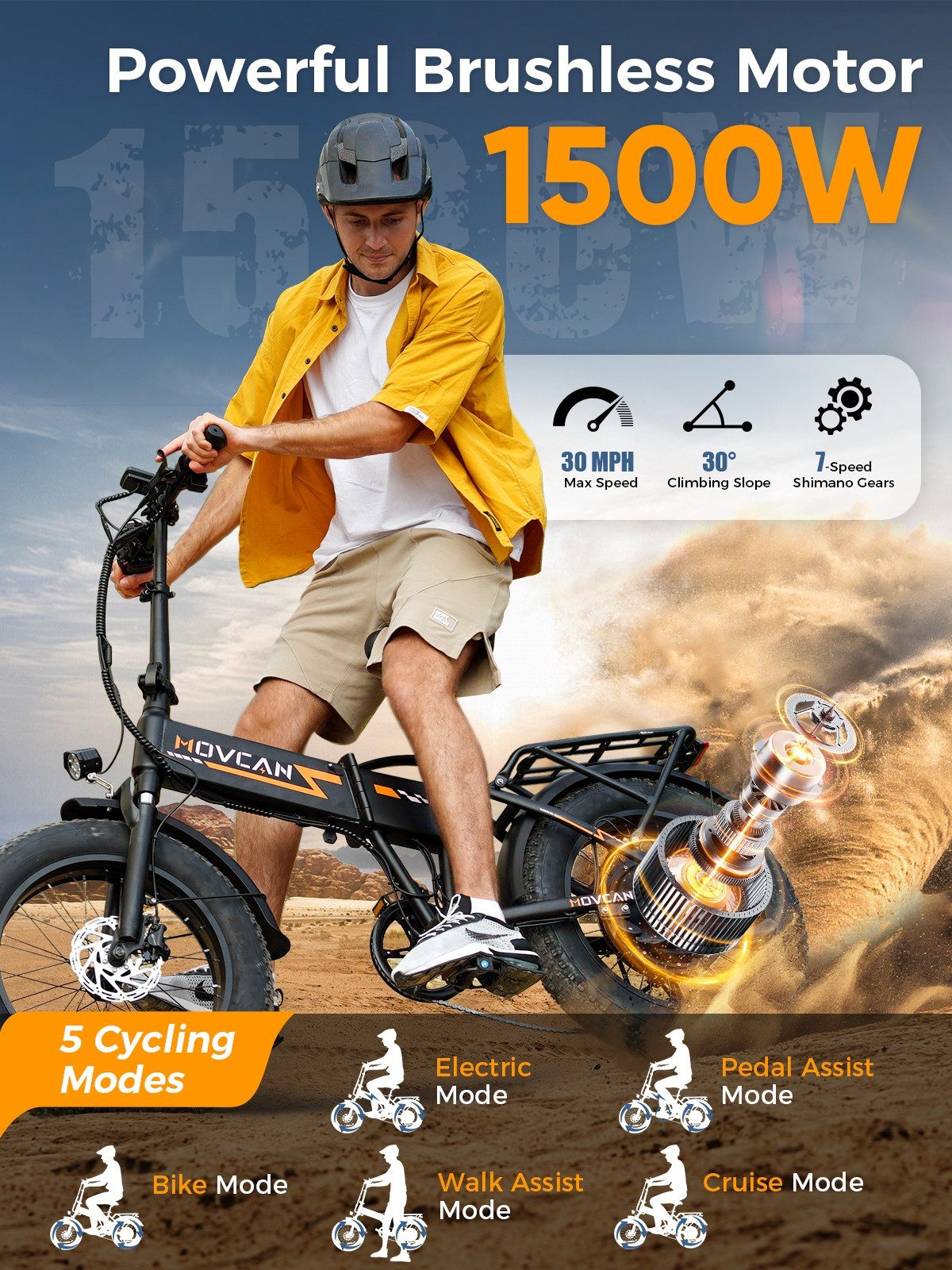 🏍 Conquer All Terrains! Movcan Q20 Basic Information: Brand: movcan Theme: Motorcycle Age Range (Description): Adult Recommended Use: Off-road Bicycle Type: Mountain Bike Style: Q20 Color: Black, Green, White, Rose Warranty Type: Extended Maximum Weight Recommendation: 330 Pounds Assembly Required: Yes Bicycle Gear Shifter Type: Trigger Number of Handles: 2 Skill Level: Intermediate Size: 66*26.5*47.2inch Bike Weight:77lb Warranty Description:1 Year Warranty for the Most Parts and 6 Months for Battery, Brake and Tire Technical Details: Seat Material Type: Leather Gear Shift: 5 Speed Level (Default PAS) Pedal Assist: 7 Speed (Work with PAS) Speed: Up to 30MPH Range: Up to 30 Miles per Charge (Pure Electric), 70 Miles per Charge (PAS Mode) Motor: 1500W Battery:52V 15.6Ah Removable Battery Charging Time: 6 Hour Tires: 20"x4" All-Terrain Fat Tire Frame Material: Alloy Steel Material:Carbon Steel Wheel Material:Aluminum Suspension Type: Dual Special Feature: Dual Suspension, Dual Battery, Hydraulic Brakes,LCD Display Included Components: Tool Kit,Phone Holder,Air Pump,Password Lock Brake: Double Hydraulic Brake Package Content: 1 x Electric Bicycle 1 x Removable Lithium-Ion Battery 1 x Charger 1 x Tool Kit 1 x Instruction 1 x Accessories Kit 【1500W Motor & 52V 15.6Ah Removable Battery for Extended Rides】The Movcan Q20 electric bike for adults integrates a 1500W brushless motor capable of reaching 30MPH with stable acceleration. Powered by a 52V 15.6Ah lithium-ion battery, it delivers 40 miles per charge in pedal-assist mode. The removable hidden battery allows flexible charging at home, office, or public stations. As a foldable electric bike, it maintains robust performance for daily commutes while optimizing energy efficiency 【Space-Optimized Folding Design for Urban Mobility】Engineered for practicality, the Movcan Q20 folding electric bike features a reinforced hinge mechanism that folds in 20 seconds. The compact footprint fits standard car trunks, apartment closets, and public transit storage areas. Ideal for commuters transitioning between trains, buses, and offices, this folding ebike reduces parking costs while maintaining full-sized bike stability. Practical storage solutions included in the design 【20"x4" Multi-Surface Tires & NFC-Enabled Display】Equipped with 20"x4" fat tires, the Movcan Q20 fat tire electric bike for adults provides reliable traction on pavement, packed trails, and wet surfaces. The tread pattern minimizes rolling resistance while preventing debris buildup. A waterproof LCD display shows real-time speed, battery percentage, and distance traveled. NFC card authentication adds theft deterrence. Suitable for year-round commuting in rain or light snow 【Adjustable Front Suspension & Hydraulic Disc Brakes】The Movcan Q20 electric bike incorporates a travel suspension fork with preload adjustment to absorb urban potholes and curb impacts. Hydraulic dual brakes reduce braking distance by 50% in wet conditions, which greatly reduces bumps during riding and improves riding stability and ensures your safety when enjoying the speed.This folding electric bike prioritizes control during sudden stops or downhill rides 【5 Riding Modes & 7-Speed Gearing】Customize your ride with the Movcan Q20 electric bike! Choose from 5 modes—Pure Electric, PAS, Cruise, Walk, and Bike—to match your terrain and mood. The professional 7-speed transmission adapts seamlessly to urban commutes or mountain trails. This movcan electric bike adapts to diverse scenarios – from crowded downtown streets to park pathways 【90% Pre-Assembled & 12-Month Warranty for Hassle-Free Setup】Get rolling in minutes! The Q20 ebike arrives 90% pre-assembled, with video tutorials and tools included for quick setup. Backed by a 12-month warranty, the Movcan Q20 folding electric bike for adults comes with 24/7 customer support. Pro tip: Please reserve the original package for some time in case of any issues of return. Whether you're a beginner or a pro, this movcan electric bike is designed for effortless ownership Note: Our products have been certified under UL2849 safety standards.