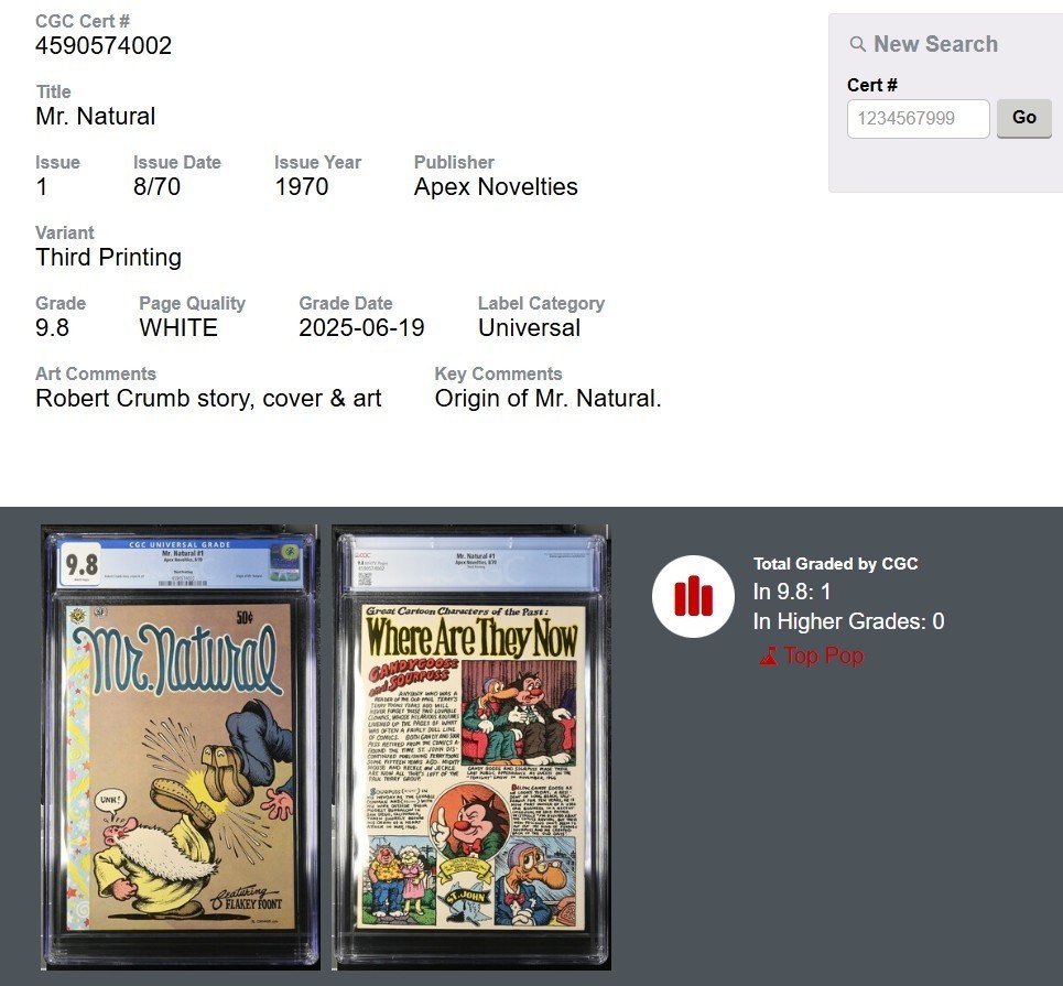 Mr. Natural #1 CGC 9.8, Origin of Mr. Natural, Apex Novelties, White Pages Robert Crumb Story, Cover and Art Collector's item! only 1 copy of this exist in this grade. Pages: 28 Published: August 1970 Publisher: San Francisco Comic Book Company Artist: Robert Crumb Origin of: Mr. Natural Third Print, Have any Questions? Click the Ask a question link at the top of the listing. PAYMENT : We accept eBay Payments. must be received within 3 days from the auction end date to receive your comic fast as possible. Shipping in the (USA): Media Mail Tracked and Insured. RETURNS : Buyer may return the item within 14 days. Items MUST be returned in the same condition and must be packaged as it was received then You will receive a refund for the full amount "Excluding Shipping fees". when it arrives and is checked. Your/Our FEEDBACK - Each buyer will receive positive feedback at the end of every successful Transaction, and we would appreciate feedback in return! Thank You! for looking Feel free to check out our other comics for sale and we will be adding many more in the future Thank you for reading this long Description!