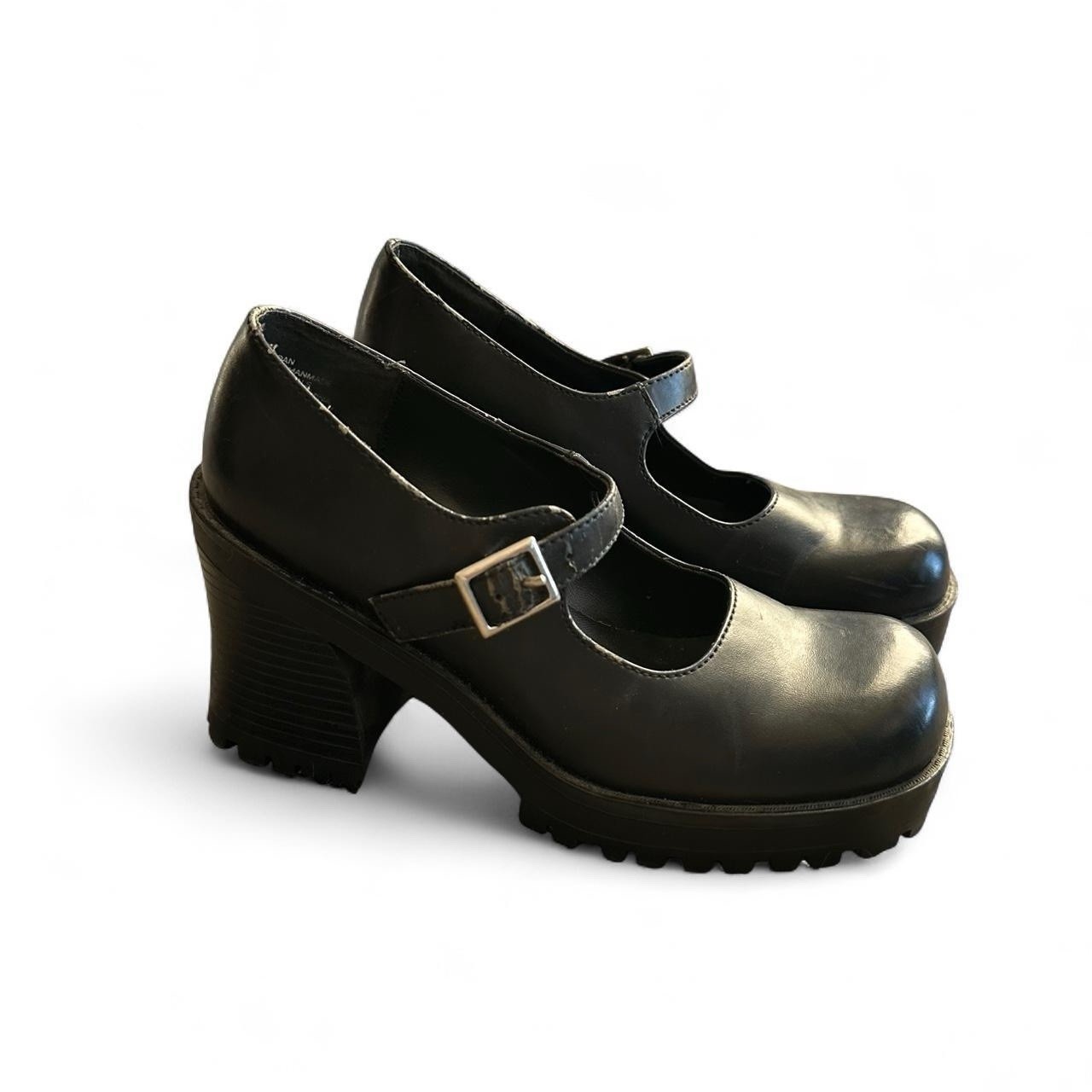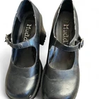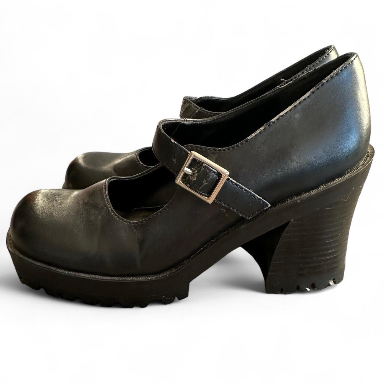 The product is a vintage 90's Mudd Joan size 6 chunky heel shoe, featuring Mary Jane style with a block heel design. The shoe is in a solid black color, made of faux leather material, and has a platform style. It is perfect for casual occasions during the summer and spring seasons. The outsole is made of rubber, and the toe shape is a classic Mary Jane design. This stylish and retro shoe is a great addition to any woman's wardrobe, adding a touch of 90s nostalgia to any outfit. Some signs of wear on the straps and top of shoes as they are vintage. Otherwise good condition very little wear in bottoms.