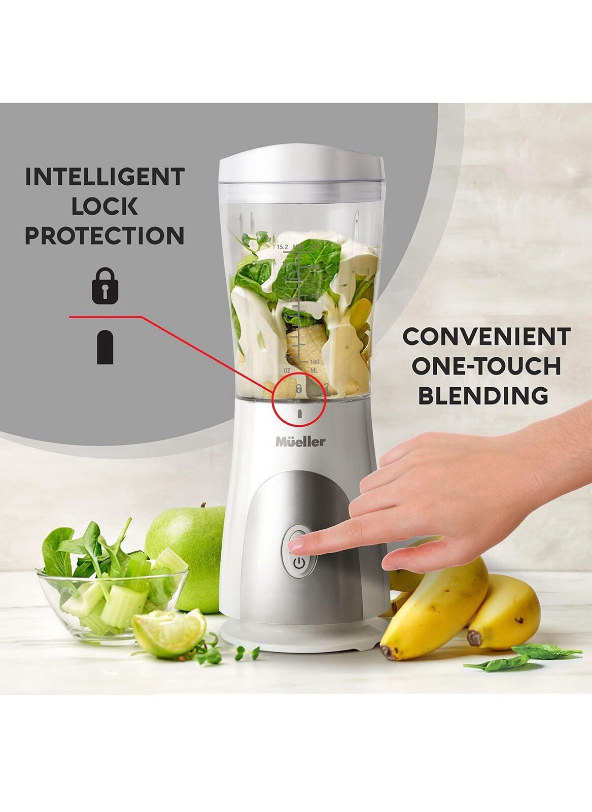 Mueller Personal Blender for Shakes and Smoothies with 15 Oz Travel Cup and Lid, Juices, Baby Food, Heavy-Duty Portable Blender & Food Processor, White (Blender Only)