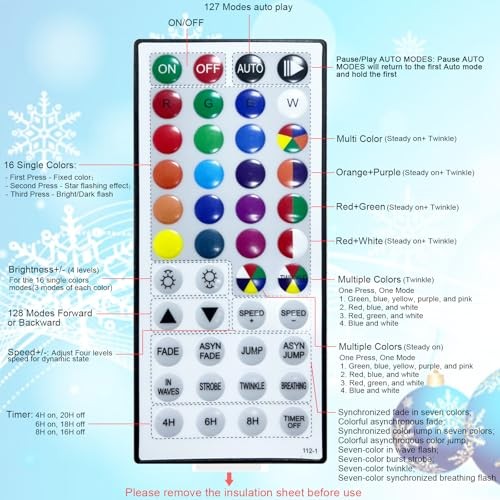 Menu 1. We require immediate payment. 2. We currently accept payment via eBay managed payments only. 3. Once payment is cleared, we will dispatch your shipment within 1-3 business days. Please refer to the "Shipping" tab for more information regarding shipping speed to your destination. Multi-Color RGB Christmas String Lights with Remote, 200 LEDs 65.6 FT 128 Modes Color Changing Christmas Tree Lights, Waterproof Christmas String Lights for Xmas House Indoor Outdoor Garden Decoration Product description Light Up Your Christmas Holiday - Our Christmas string lights features 200 LEDs, light length 65.6ft, 5m/16.4ft power cord. Dress-up your house with this sparkling string light, will quickly create a fantastic and joyful atmosp for your Christmas season, light-up your life in the new year. Multiple Holiday Themes Modes - This RGB string light comes with a 44 keys FR remote control and comes in a variety of color combinations for different holiday decorations. Such as combinations multi-color, green+red, green+red+white, red+white for Christmas, orange+purple for Halloween, red+blue+white for Independence Day ect, each light combination has a fixed and dynamic mode. You can choose the lighting mode according to the decoration style of your Christmas, save your time and cost. Multiple Lighting Modes - Up to 128 modes for you choose, Power ON/OFF, Brightness/Speed Adjustment( 4 Levels), 16 Single Color(fixed/twinkle/flash), Auto cycle(pause/play), 8 Multicolors((fixed/twinkle), FADE(7 colors fade), ASYN FADE(multicolors fade), JUMP(7 colors jump), ASYN FADE(multi-colors jump), IN WAVES(7 colors in wave flash), STROBE(7 colors burst strobe), TWINKLE(7 colors twinkle), BREATHING(7 colors breathing flash), Timer (4H( 4hrs on, 20hrs off), 6H( 6hrs on, 18hrs off), 8H( 8hrs on, 16hrs off)). Timer & Memory Function - The timer modes could set the Christmas tree lights turn on/off automatically. For example, set a 8H timer, the light will stay on for 8 hours and turn off automatically for 16 hour, and then cycle, save energy and money. The outdoor string lights will keep your last mode setting, no need to reset the mode every time, easy and convenient (Notice: If the plug power is off, the memory function will not work and you will need to reset the next time). Safe & Waterproof - The Christmas LED string lights are made of waterproof material , can withstand light rain and water splashes, also work well in snowy weather, perfect for indoor & outdoor decoration. (Notice: the plug should be used waterproof receptacle cover when used outdoor) Perfect Christmas Decoration Gift: This string light is the ideal choice for window, curtain, doors, stairs, room, home DIY, Christmas, Wedding, Party holiday decorations, you can hang it on eave, patio, deck, fence, tree, or handrail, make the scene beautiful and shiny. It's a perfect Christmas gift for your kids, parents, lovers, friends and colleagues. PLEASE MESSAGE US IF YOU HAVE ANY OTHER QUESTIONS, AND MANY THANKS FOR READING ALL OF THIS. Copyright ©#. All Rights Reserved.