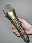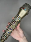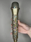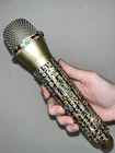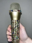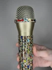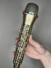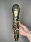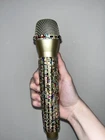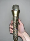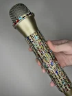 Multi-Color Rhinestone Prop Microphone - Sparkly Handmade Costume Accessory Mic. *this is a plastic fake dummy prop microphone that does not work* Gold plastic prop microphone decorated in multi-colored sparkle rhinestones. Perfect for photos, concerts, parties, and costumes. Hand decorated by myself.