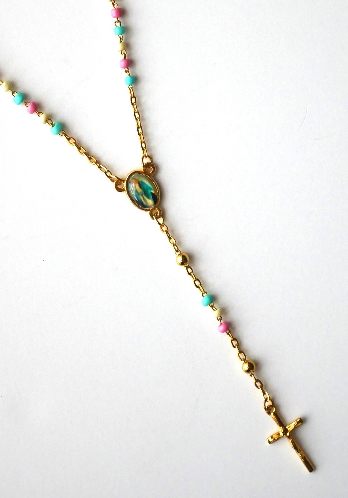 Multicolor Beads Miraculous Pocket Rosary This colorful glass rosary features a wide variety of bead colors, a beautiful Miraculous centerpiece and traditional styled crucifix. Makes a great devotional gift for kids and teens who will appreciate the uniqueness of this rosary. SIZE/LENGTH: Total length of the rosary is 14" including the Crucifix. BEADS: Quality Round Shaped Glass Beads carefully assembled on a zinc alloy chain. CENTER PIECE: Image of The Miraculous 5/8" x 3/8" CRUCIFIX: Gold tone Crucifix measures 7/8" x 3/8". Come Visit Us at Our New Store! Please feel free to email me with questions about this item. Also please check my other listings. I am always available to answer your questions promptly. Buy from us with confidence. This is a very good quality and elegant rosary that you can be proud to take anywhere.