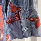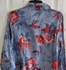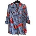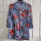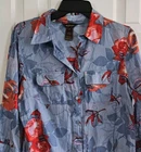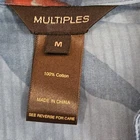 Multiples Womens Button Front Shirt 3/4 Sleeves Good pre-owned condition, no flaws Flap pockets on chest Blue with red and pink flowers and very subtle vertical stripe pattern 100% cotton, very lightweight, almost semi-sheer 5 inch slits on each side Marked a size M Approximate measurements 19 1/4 inches from armpit to armpit 30.5 inches in length from top of shoulder to bottom of hem in front