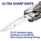 19-in-1 Multitool:This EDC multi-tool boasts 19 handy tools including a serrated rope knife, pocket knife, saw, wood & metal files, wire stripper, hard & regular wire cutters, regular pliers,needle-nose pliers, crimping pliers, can & bottle openers, marking rulers, spring-action scissors, slotted screwdriver & cross-head screwdriver, large slotted screwdriver, and glasses screwdriver. Titanium-Plated Handle:The multitool handle is Titanium-coated in a cool grey color for sturdy wear withstanding, corrosion-resisting and long-term durability. Ultra-sharp Knife:The Knife is constructed of 7Cr17 high-carbon steel with hardness up to HRC58, providing a balance of sharpness and edge-holding. It's perfect for tough jobs and outdoor adventures. Compact & Lightweight:This multipurpose tool comes in a slim design with a folded size of 4*1.53*0.79 inch and a weight of 9.35 Oz. All tools are equipped with safety locking. EDC gear for camping, hiking, construction work, home repair, and DIY. Multitool pliers:The toolset is equipped with a fitting multitool sheath in snap button closure. Both the multitool and nylon sheath are packed nicely in a color box.