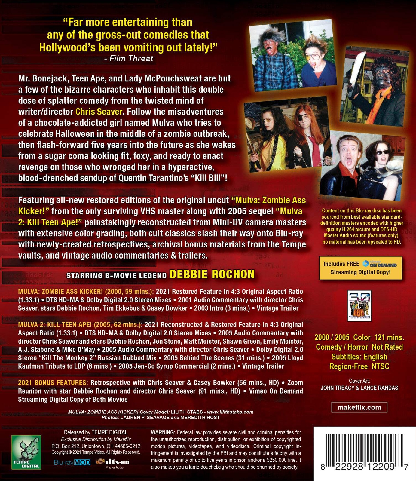 Mulva Double Feature - Two horror comedies Debbie Rochon funny gory NEW BLU-RAY! Mr. Bonejack, Teen Ape, and Lady McPouchsweat are but a few of the bizarre characters who inhabit this double dose of splatter comedy from the twisted mind of writer/director Chris Seaver. Follow the misadventures of a chocolate-addicted girl named Mulva who tries to celebrate Halloween in the middle of a zombie outbreak, then flash-forward five years into the future as she wakes from a sugar coma looking fit, foxy, and ready to enact revenge on those who wronged her in a hyperactive, blood-drenched sendup of Quentin Tarantino’s “Kill Bill”!Featuring all-new restored editions of the original uncut “Mulva: Zombie Ass Kicker!” from the only surviving VHS master along with 2005 sequel “Mulva 2: Kill Teen Ape!” painstakingly reconstructed from Mini-DV camera masters with extensive color grading, both cult classics slash their way onto Blu-ray with newly-created retrospectives, archival bonus materials from the Tempe vaults, and vintage audio commentaries & trailers. MULVA: ZOMBIE ASS KICKER! (2000, 59 mins.) NEW! 2021 Restored Feature in 4:3 Original Aspect Ratio (1.33:1) NEW! DTS HD-MA & Dolby Digital 2.0 Stereo Mixes 2001 Audio Commentary with director Chris Seaver, stars Debbie Rochon, Tim Ekkebus & Casey Bowker 2003 Intro (3 mins.) NEW! Optional English Subtitles Vintage Trailer MULVA 2: KILL TEEN APE! (2005, 62 mins.) NEW! 2021 Reconstructed & Restored Feature in 4:3 Original Aspect Ratio (1.33:1) NEW! DTS HD-MA & Dolby Digital 2.0 Stereo Mixes 2005 Audio Commentary with director Chris Seaver and stars Debbie Rochon, Jen Stone, Matt Meister, Shawn Green, Emily Meister, A.J. Stabone & Mike O’May 2005 Audio Commentary with director Chris Seaver NEW! Dolby Digital 2.0 Stereo “Kill The Monkey 2” Russian Dubbed Mix 2005 Behind The Scenes (31 mins.) 2005 Lloyd Kaufman Tribute to LBP (6 mins.) 2005 Jen-Co Syrup Commercial (2 mins.) NEW! Optional English Subtitles Vintage Trailer 2021 BONUS FEATURES: NEW! Retrospective with Chris Seaver & Casey Bowker (56 mins., HD) NEW! Zoom Reunion with star Debbie Rochon and director Chris Seaver (91 mins., HD) NEW! Insert with Vimeo On Demand Streaming Digital Copy of Both Movies (Makeflix Exclusive) FAST FACTS:2000 / 2005 • Color • 121 mins. • Comedy / Horror • Not Rated • Subtitles: English • Region-Free • NTSC Content on this Blu-ray disc has been sourced from best available standard-definition masters encoded with higher quality H.264 picture and DTS-HD Master Audio sound (features only); no material has been upscaled to HD. DISCLAIMER: ALL DISCS MANUFACTURED ON DEMAND USING HIGH-QUALITY BD-R WITH ORIGINAL PRINTED ARTWORK. Mr. Bonejack, Teen Ape, and Lady McPouchsweat are but a few of the bizarre characters who inhabit this double dose of splatter comedy from the twisted mind of writer/director Chris Seaver. Follow the misadventures of a chocolate-addicted girl named Mulva who tries to celebrate Halloween in the middle of a zombie outbreak, then flash-forward five years into the future as she wakes from a sugar coma looking fit, foxy, and ready to enact revenge on those who wronged her in a hyperactive, blood-drenched sendup of Quentin Tarantino’s “Kill Bill”! ” painstakingly reconstructed from Mini-DV camera masters with extensive color grading, both cult classics slash their way onto Blu-ray with newly-created retrospectives, archival bonus materials from the Tempe vaults, and vintage audio commentaries & trailers. MULVA: ZOMBIE ASS KICKER! (2000, 59 mins.) NEW! 2021 Restored Feature in 4:3 Original Aspect Ratio (1.33:1) NEW! DTS HD-MA & Dolby Digital 2.0 Stereo Mixes 2001 Audio Commentary with director Chris Seaver, stars Debbie Rochon, Tim Ekkebus & Casey Bowker 2003 Intro (3 mins.) NEW! Optional English Subtitles Vintage Trailer MULVA 2: KILL TEEN APE! (2005, 62 mins.) NEW! 2021 Reconstructed & Restored Feature in 4:3 Original Aspect Ratio (1.33:1) NEW! DTS HD-MA & Dolby Digital 2.0 Stereo Mixes 2005 Audio Commentary with director Chris Seaver and stars Debbie Rochon, Jen Stone, Matt Meister, Shawn Green, Emily Meister, A.J. Stabone & Mike O’May 2005 Audio Commentary with director Chris Seaver NEW! Dolby Digital 2.0 Stereo “Kill The Monkey 2” Russian Dubbed Mix 2005 Behind The Scenes (31 mins.) 2005 Lloyd Kaufman Tribute to LBP (6 mins.) 2005 Jen-Co Syrup Commercial (2 mins.) NEW! Optional English Subtitles Vintage Trailer 2021 BONUS FEATURES: NEW! Retrospective with Chris Seaver & Casey Bowker (56 mins., HD) NEW! Zoom Reunion with star Debbie Rochon and director Chris Seaver (91 mins., HD) NEW! Insert with Vimeo On Demand Streaming Digital Copy of Both Movies (Makeflix Exclusive) FAST FACTS: 2000 / 2005 • Color • 121 mins. • Comedy / Horror • Not Rated • Subtitles: English • Region-Free • NTSC Content on this Blu-ray disc has been sourced from best available standard-definition masters encoded with higher quality H.264 picture and DTS-HD Master Audio sound (features only); no material has been upscaled to HD. DISCLAIMER: ALL DISCS MANUFACTURED ON DEMAND USING HIGH-QUALITY BD-R WITH ORIGINAL PRINTED ARTWORK. eBay integration by