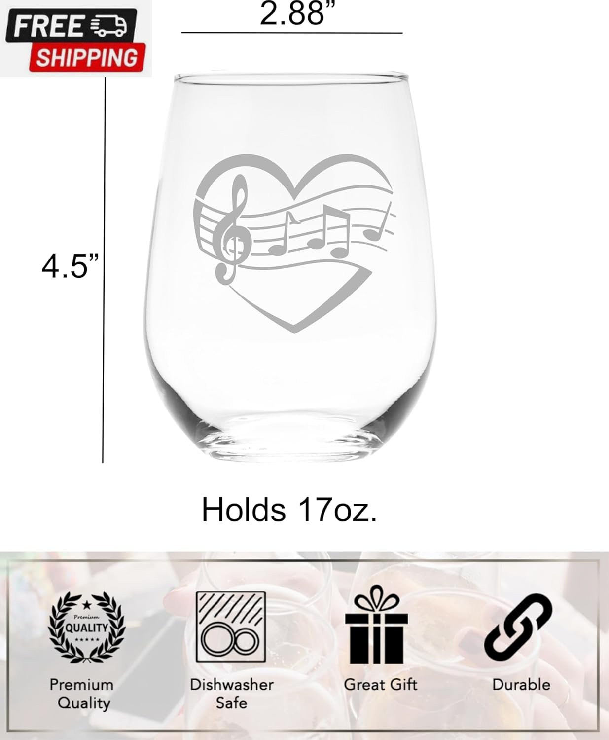 Absolutely love this wine glass! The etched music notes add such a stylish touch, and the 17-oz size is perfect for generous pours. The stemless design feels modern and sturdy—great for everyday use or gifting. Super fast shipping, and the quality is fantastic. Highly recommend for any music lover!