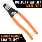 Like a Hot Knife Through Butter: The stainless steel wire cutter compound leverage design helps you effortlessly cut stainless steel wire rope, steel bicycle brake cable and aircraft cable up to 5/32'' (4mm) in diameter. Ergonomic: Give your hands the break they deserve. Our bicycle cable cutters ergonomic handle design helps eliminate fatigue from extended use. The bike wire cutters also easily fit into most tool pouches. A great seal cutter for truck drivers. Built To Last: The chicken wire cutters heavy duty cutting heads undergo a specialty heat treatment process which allows these piano wire cutters to cut just as cleanly the 100th time as they did the 1st time. Great barb wire cutters for working on fencing. Heavy Duty: Made from precision forged alloy steel, our firefighter wire cutters work just as hard as you do. Our compact small cable cutters use compound leverage to allow you to slice through stainless steel wire rope with just one hand. Limited Lifetime Manufacturer Warranty: This cable cutter tool is backed by the Limited Lifetime Warranty for your complete peace of mind. Our wire rope cutters heavy duty are professionally made in China. Cuts Steel Wire Up to 5/32" (4mm): This compact steel wire rope cutter delivers clean cuts through steel cables, brake lines, and aircraft wire—ideal for precision jobs requiring powerful results in a small package. Engineered for Repeated Use: Made of heat-treated CRV steel, this wire rope cutter is built for endurance and reliability—slice through multiple cables without dulling or deforming. Ergonomic for All-Day Use: Designed with comfort in mind, these cable cutters for steel wire feature non-slip orange handles and a spring-action design that reduces hand fatigue. Secure Storage, Safe Use: A built-in latch keeps these stainless steel wire cutters compact and protected when not in use—perfect for tool belts, bags, and mobile repair kits. Pro Tool, Lifetime Warranty: Whether you're a pro or DIYer, these aircraft cable cutters deliver consistent results—trusted as durable cable wire cutters for electrical, fencing, or cycling jobs.