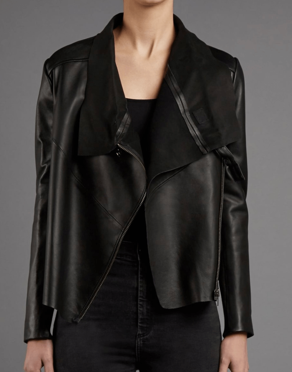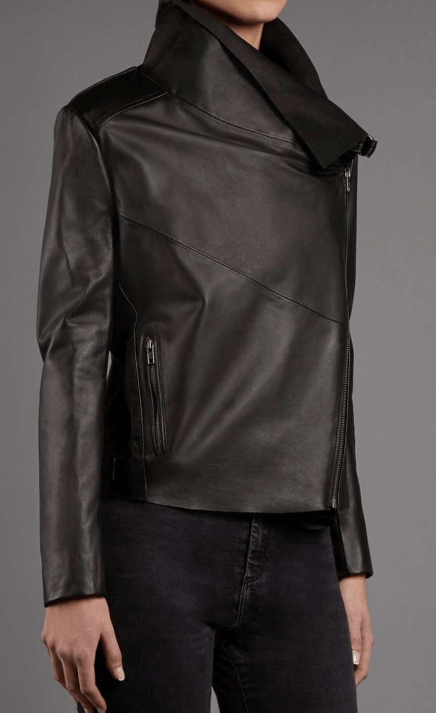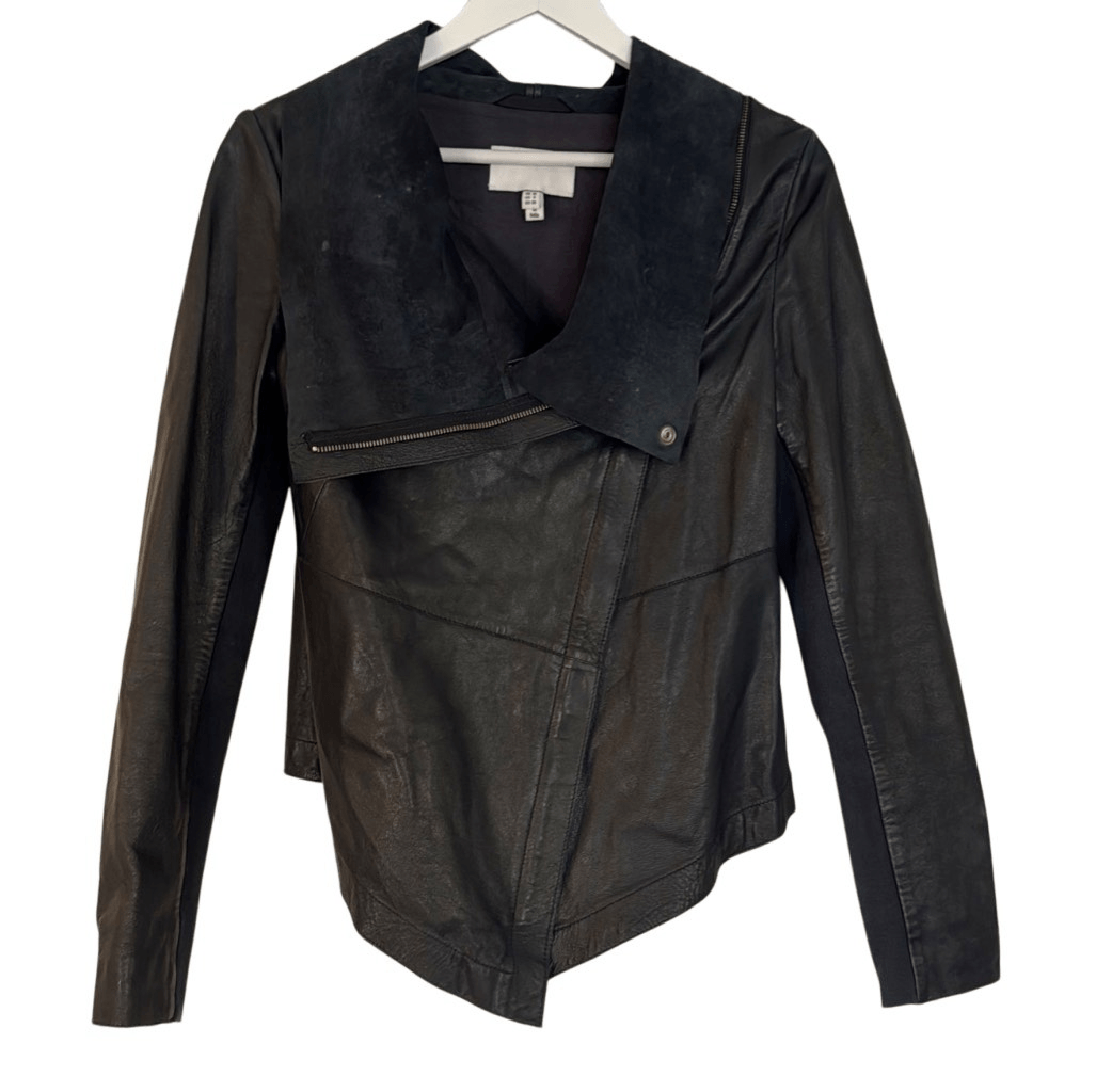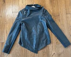 Brand: Muubaa Description: genuine lamb leather draped neck jacket can be zipped up or worn open Size: 6 Color: navy blue almost black Condition: Gently Worn Very Good - a few wear marks on interior collar Measurements: Pit to pit: 17” Length: 27” **Bundle and Save!!** all measurements are approximate and taken laying down