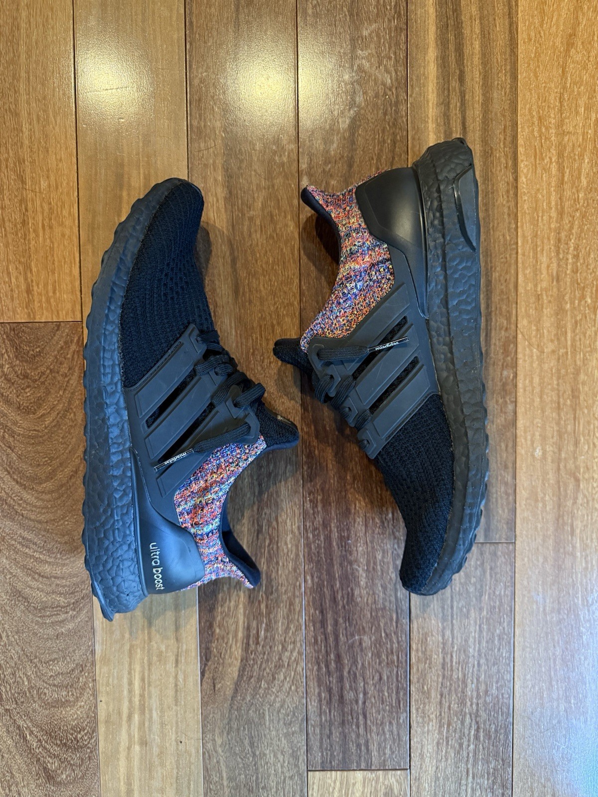 The My Adidas Ultraboost 3.0 Running Shoes in black and multicolored are designed for active men who enjoy running and jogging. Featuring a low top lace-up style with a rubber outsole and foam insole, these sneakers provide comfort and support for spring season activities. The Upper material is Primeknit+ and the Boost technology ensures energy return with each step, making them a stylish and functional choice for athletic wear. Made by Adidas, these shoes combine fashion and performance in a sleek and modern design.