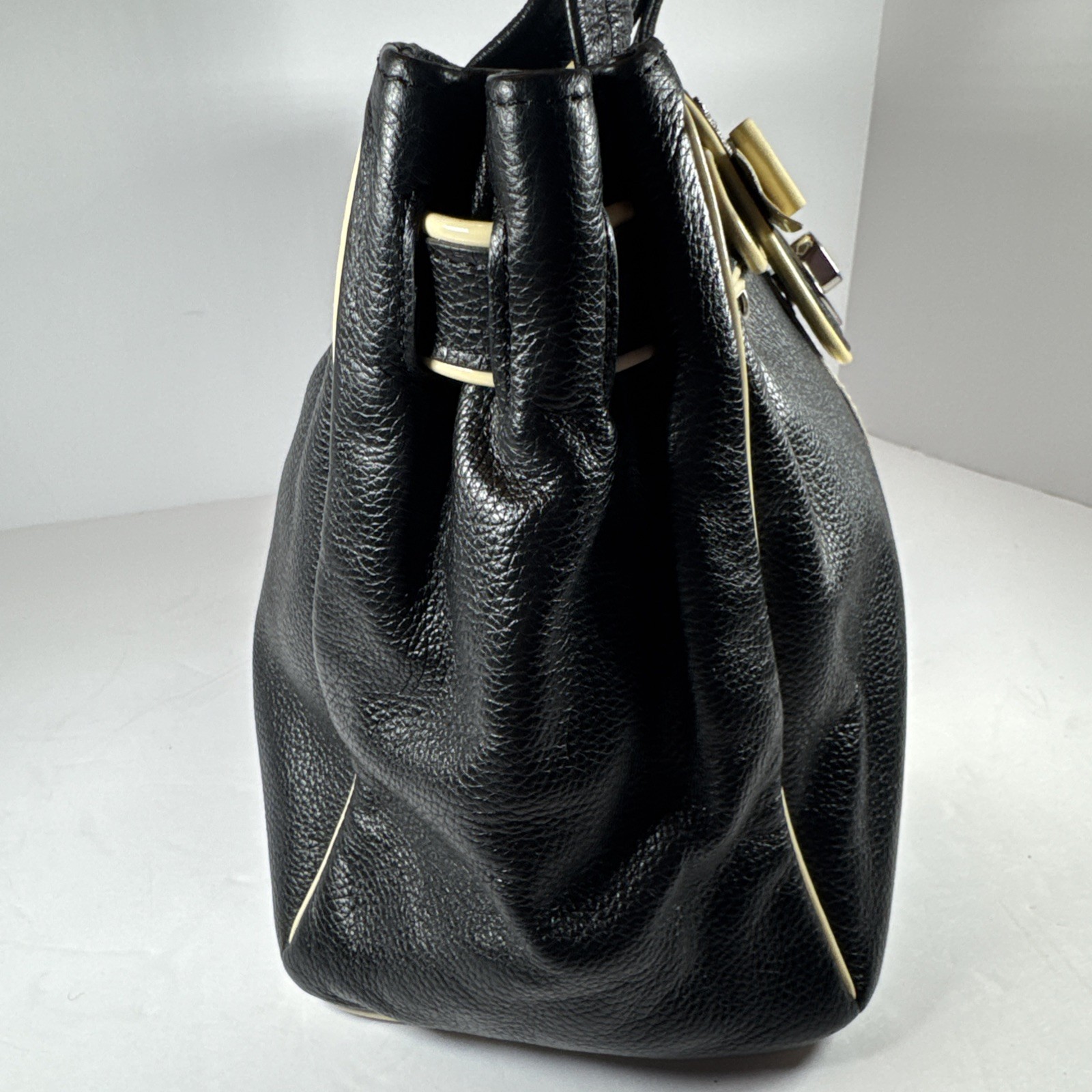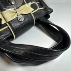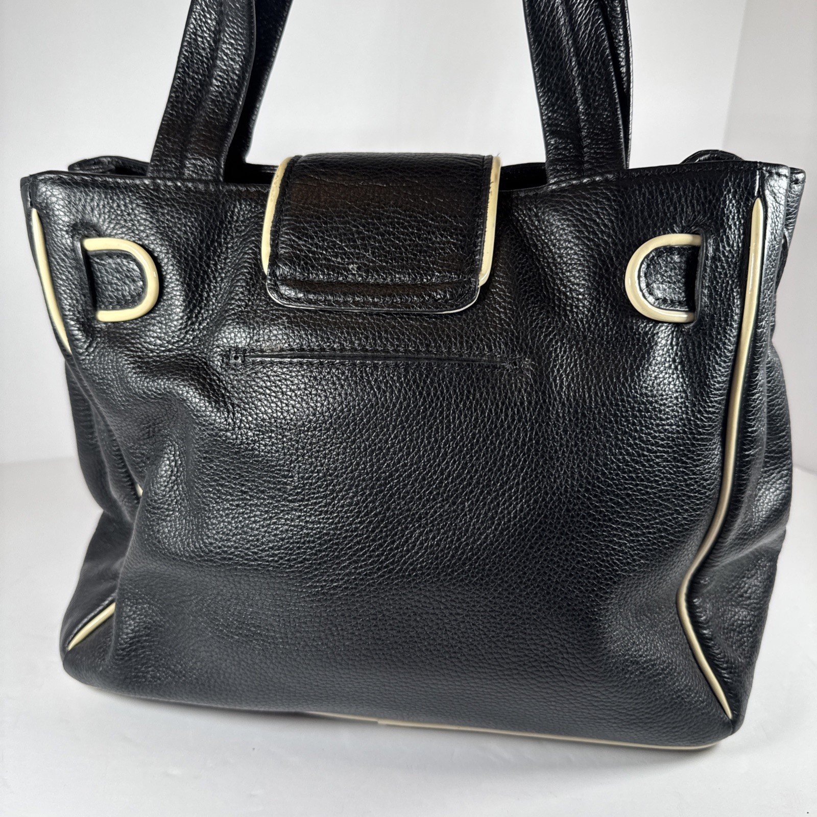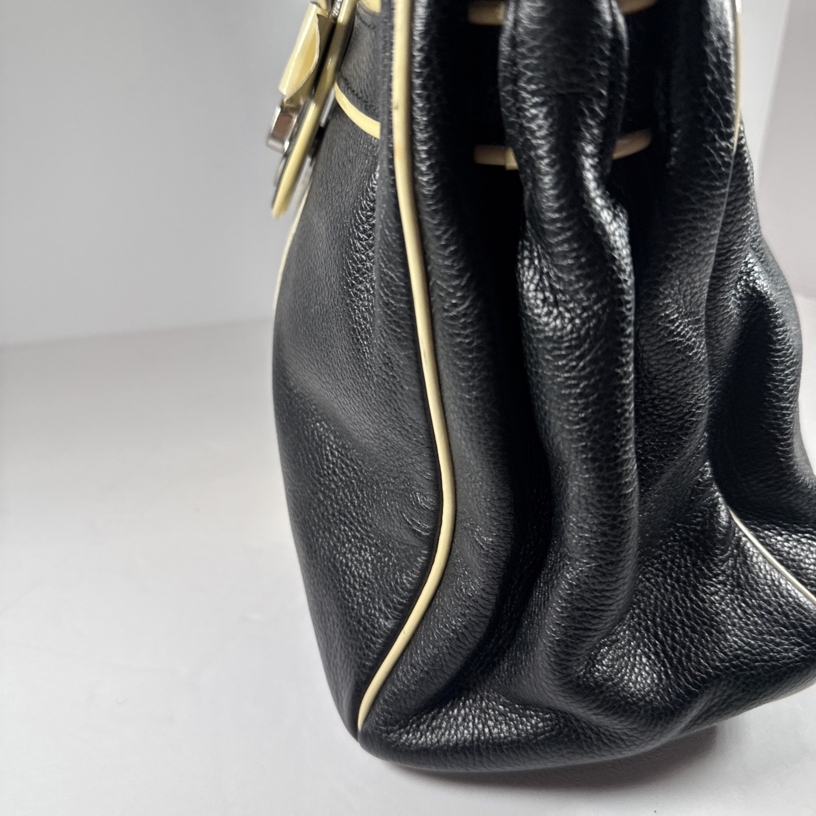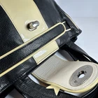 The My Flat In London Debutante Black & Cream Pebbled Leather Top/Satchel is a stylish and versatile handbag designed for women. Made of pebbled leather with a turn lock closure, this medium-sized bag features double black handles with a 5" drop. The exterior color is a sleek combination of black and white, with pink accents and rhinestone details adding a touch of sophistication. The interior is equipped with multiple pockets, a credit card holder, and an organizer, making it both fashionable and functional. This satchel/top handle bag from My Flat In London is perfect for any outfit or occasion.