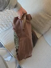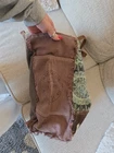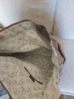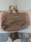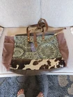 This is a Myra XL Weekender Tote featuring a green floral print on canvas and leather. The bag has a rectangular shape with double brown leather handles, fringe accents, and antique brass hardware. It includes inner and outer pockets, a zip, magnetic, and snap closure, and is lined with cotton. This travel or casual bag is extra large in size, measuring 19 inches wide, 15.5 inches tall, and 8.5 inches deep. New with tags.