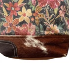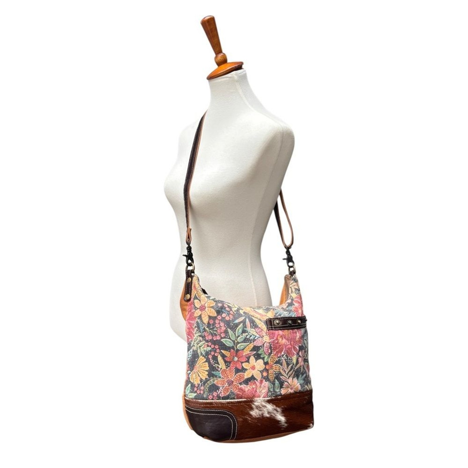 Myra Bag “Sillage” Crossbody or Shoulder Bag - Convertible Floral Bag Leather, Upcycled Cotton Canvas, and Hair-on Hide Adjustable Movable Leather & Canvas Strap Outside Pouch Pocket with Metal Studs Outside Zip Pocket Zip Closure at Top Inside 100% Cotton Lining with Myra Logo Zip Pocket and 2 Pouch Pockets Inside Bronze Hardware Approximate Measurements: 13” W x 12” H x 5” D Strap Drop Length about 22” for Crossbody but adjustable to make longer or shorter Boho Western Cowgirl I have seen a lot of Myra has but I have never seen floral one! This is a beauty! Minor Blemishes on Inside - See Last 2 Photos Overall Excellent Condition