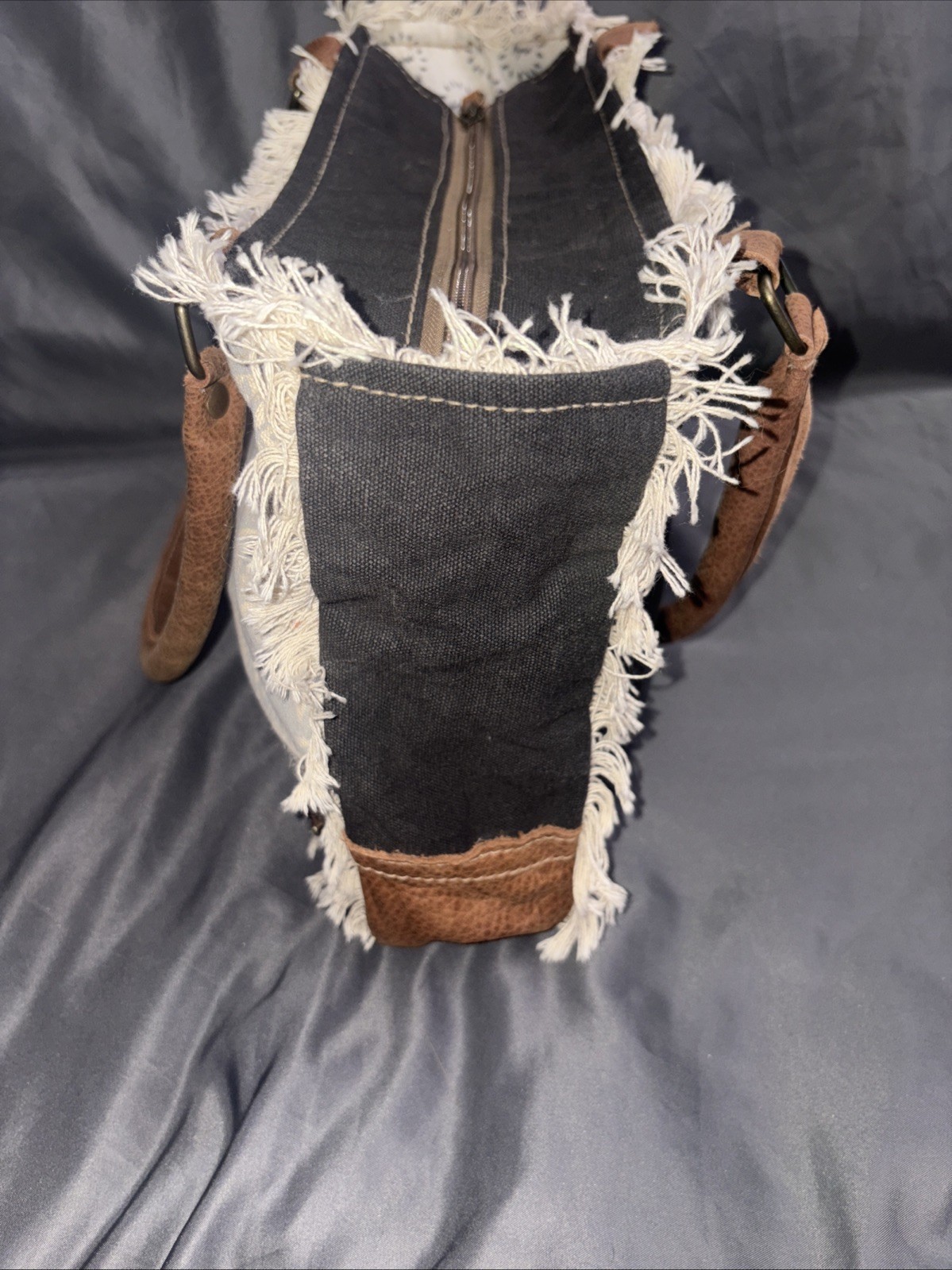 The Myra Top Handle Bag in Dove Gray Black Canvas Leather Fur Cotton with Fringe and Studded accents is a stylish and versatile accessory for women on the go. This medium-sized crossbody shoulder bag features a rectangular shape with a zip closure and double brown leather handles. The exterior is made of a combination of fur, canvas, leather, and cotton, with accent details like studded hardware and cowhide fur accents. Perfect for travel and casual outings, this bag combines a western, native, Aztec, and bohemian theme with a free spirit character. It also includes inner pockets, an adjustable cross-body strap, and a detachable strap for added convenience.