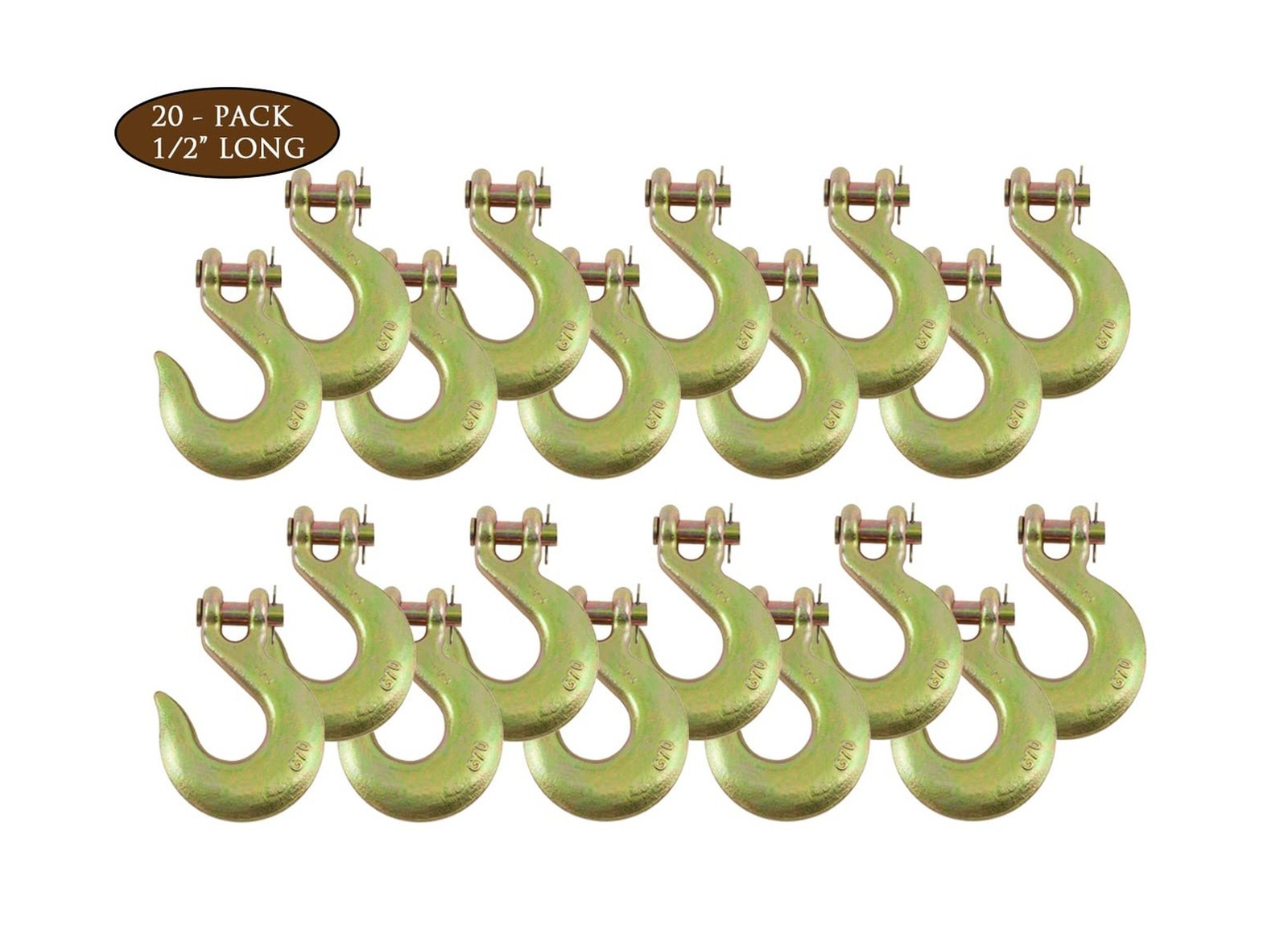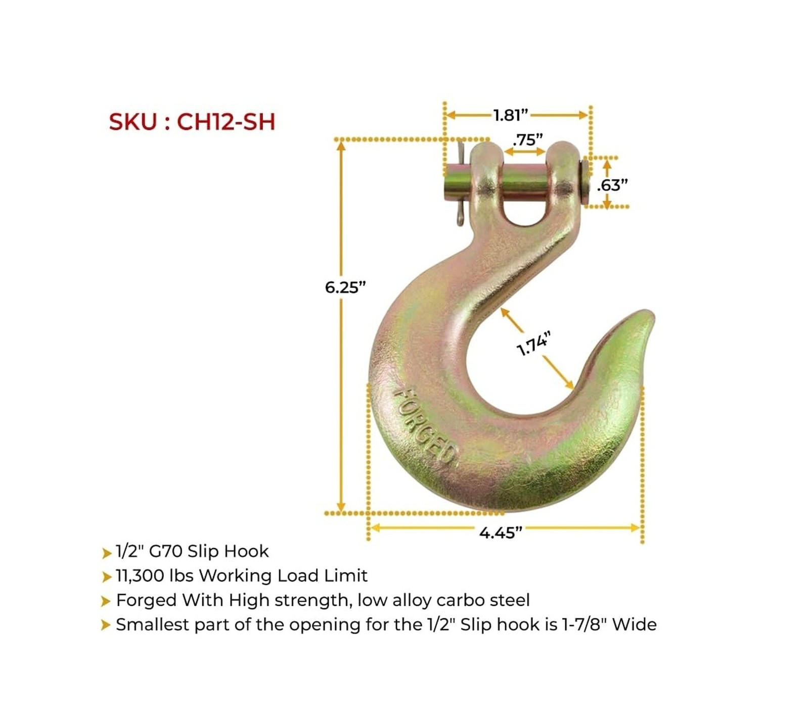 Mytee Products (20 Pack 1/2" Clevis Slip Hook - 11,300 LBS WLL Heavy Duty Grade 70 Tow Chain Hook for Truck Trailer Tie Down Description Pack Size: 20 PackSize: 1/2" G70 Slip HookWorking Load Limit: 11,300 lbsForged With High strength, low alloy carbon steel Smallest part of the opening for the 1/2" Slip hook is 1-7/8" WideEnd Fitting: S HookColor: Gold Chromate Features: Heavy Duty Performance - With a 11300 lbs Working Load Limit, this clevis hook is built to handle heavy duty loads, perfect for towing applications. Secure Hold - Designed with a wide throat, this trailer hook securely holds webbing, chain, master links, & shackles, aiding in effective shortening or choking of your chain length. Corrosion-Resistant - Equipped with an anti-rust coating, this slip hook withstands rain, snow & mud, ensuring long-term use & durable strength. Adaptability - Featuring a wider throat than grab hooks, this slip hook accommodates different trailer setups & hitch loops, allowing the chain to move freely for more flexibility. Versatile Use - Ideal for attaching heavy-duty safety chains or securing transport binder chains, this chain hook for trailer is versatile, finding utility in trailers, trucks, cranes, tractors, & more. Product Details: Color: 20 - Pack Brand: Mytee Products Material: Alloy Steel Style: Without Latch Weight Limit: 11300 Pounds Package Dimensions : 10 x 10 x 10 inches; 62 Pounds Item model number : CH12-SHx20-PK Date First Available : July 22, 2022 Manufacturer : Mytee Products Best Sellers Rank: #65,766 in Automotive (See Top 100 in Automotive) #72 in Tow Hooks #72 in Tow Hooks Customer Reviews: 4.6 4.6 out of 5 stars (172) Delivery We Do Not Ship Outside of the Continental US. Return Policy All items qualify for returns within 30 days of receipt. Buyer is responsible for return shipping on any item that is not damaged. Feedback We take our reputation seriously, we buy and sell online, so we understand the value of trust. If you are unsatisfied with your order, please contact us and we will work with you to resolve it to your satisfaction.