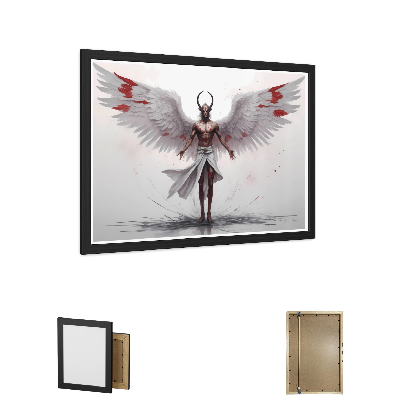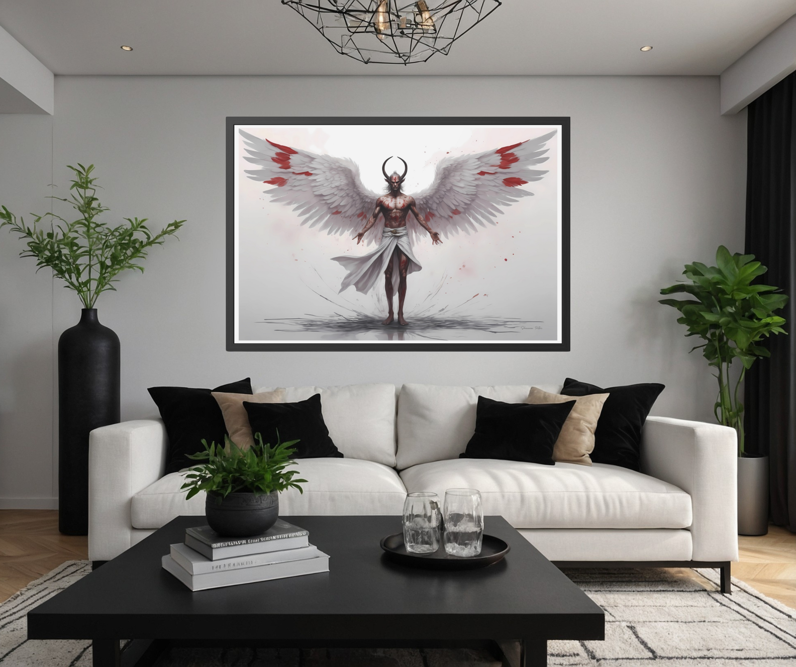 "Fallen Angel" – Mythological Hand-Sketched Print Experience the raw emotion and divine intensity of "Fallen Angel" , a breathtaking hand-sketched mythological print by Hypnotik Creations , personally signed by the artist . This masterful illustration captures a fallen angel in a moment of defiance and sorrow, its wings spread wide , evoking a powerful biblical narrative of grace and exile. Expertly printed in HDR on premium 200 gsm matte photo paper using Misaki UV Inks , this piece delivers rich, deep contrasts and striking detail . The print is elegantly framed in a hand-crafted black wooden frame , made from durable pine wood with a semi-wide, smooth finish . A thin white outline enhances the composition, making it ideal for both light and dark-colored walls . The shatterproof and scratch-resistant Perspex (Plexiglas) insert provides superior protection while maintaining a crystal-clear view of the artwork. Each framed print is crafted in the UK using eco-friendly, globally sourced, and recycled materials . It arrives ready to hang , complete with an enclosed back and a hanging kit included . Key Features: ✔ Exclusive hand-sketched mythological print signed by the artist ✔ Depicts a fallen angel with wide-spread wings in biblical artistry ✔ Printed in HDR on 200 gsm matte photo paper for deep contrast and vivid details ✔ Misaki UV Inks ensure bright, long-lasting colors ✔ Hand-crafted black wooden frame with a smooth semi-wide finish ✔ Shatterproof & scratch-resistant Perspex (Plexiglas) insert for lasting protection ✔ Thin white outline enhances contrast on any wall color ✔ Eco-friendly frame made from globally sourced and recycled materials ✔ Ready to hang out of the box with enclosed back & included hanging kit ✔ Wipe clean with a dry cloth to maintain pristine condition Elevate your space with this powerful and thought-provoking artwork , a timeless blend of mythology, spirituality, and artistic brilliance . 4o