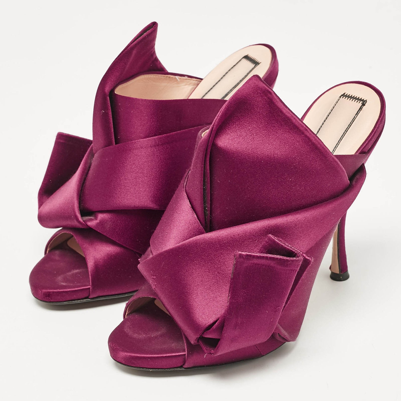 Our eBay Store About Us Contact Us Add to Favorite Sellers Nº21 Burgundy Satin Raso Knot Peep Toe Mules Size 39 Add a touch of luxury to your wardrobe with these Nº21 peep-toe mules in burgundy satin. The signature oversized knot detail with the sleek silhouette and rich hue make these mules a standout option for special occasions. Product Details Brand N21 Color Burgundy Heel Height 13 cm Material Satin Size 39 Certified by The Luxury Closet This item has gone through a detailed authentication process overseen by our experts. We offer a lifetime guarantee of authenticity on all our items. How We Check The in-house team of experts at The Luxury Closet is highly trained to verify the authenticity and the condition of the luxury products. They ensure that only 100% authentic items are put on sale.The evaluation process is unique with its own mix of assessment criteria and differs according to the category. Each item is evaluated based on the following combination of hallmarks, hardware, stitching, symmetry, material, craftsmanship, stamping, codes, hologram stickers, and packaging. Our authenticators also check if the items have been modified or amended (e.g., aftermarket diamonds, replaced batteries, repaired bags, etc.) International Buyers Import duties, taxes and charges are not included in the item price. These charges are the buyers responsibility. Please check with your country’s customs office to determine what these additional cost will be prior to buying.