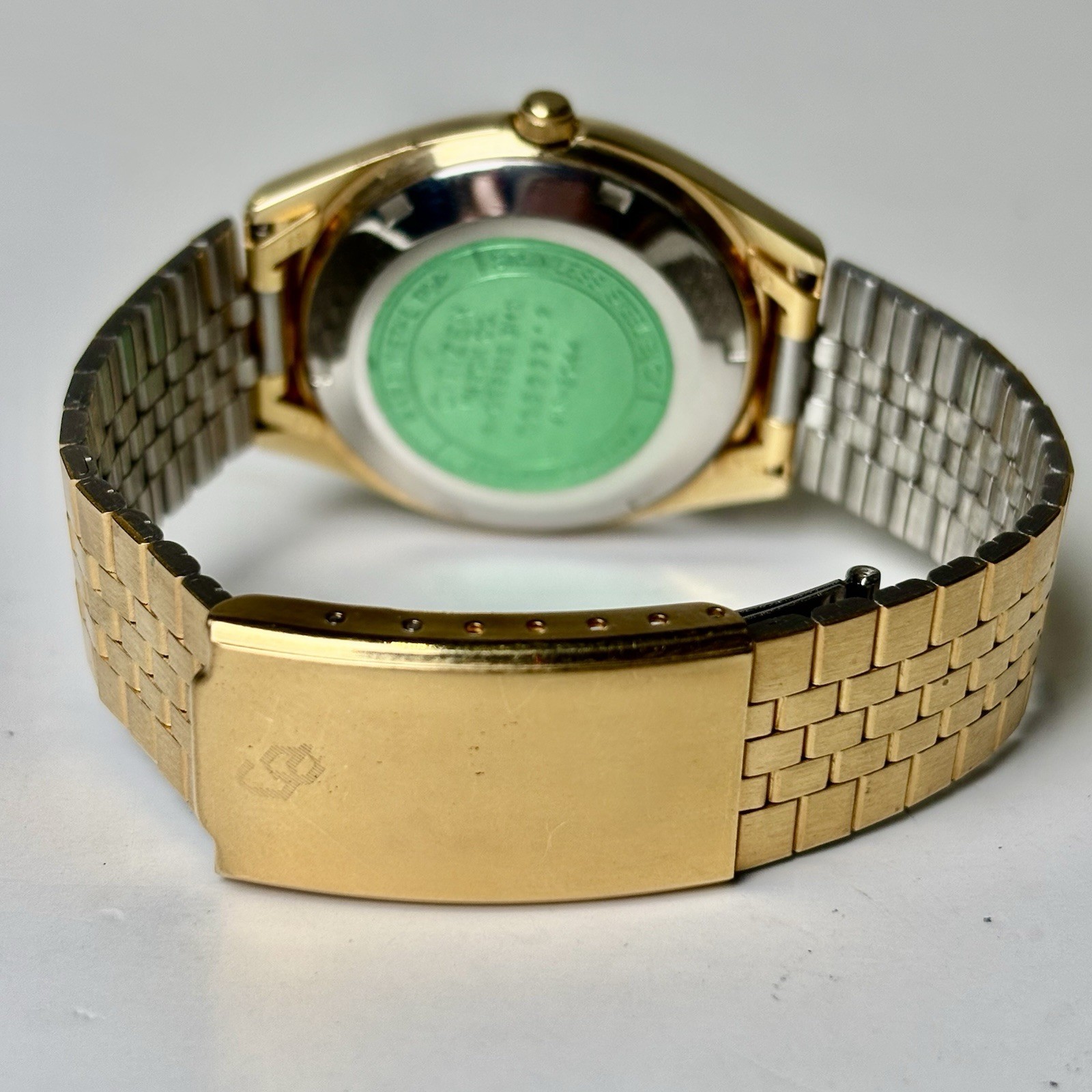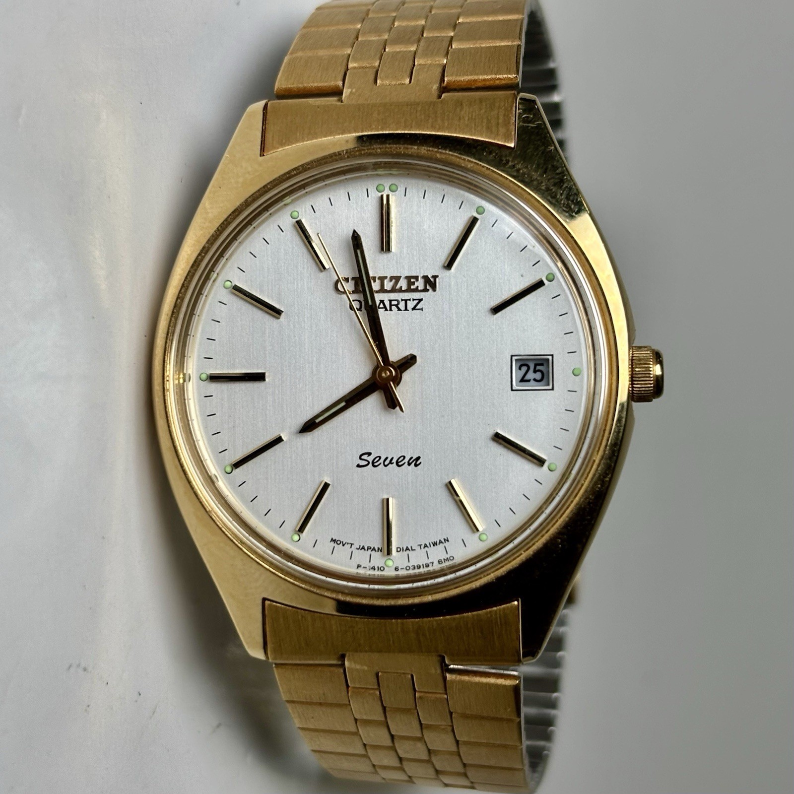 NEW BATTERY! The product is a classic Citizen Seven Quartz men's wristwatch with a 35mm round case made of stainless steel. The watch features a gold stainless steel bezel and band, a silver dial, luminous hands, and a date indicator. With its elegant design and reliable quartz movement, this watch is perfect for everyday wear.