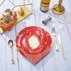 The N9R 225PCS Red Gold Plastic Plates Set is a versatile and elegant disposable dinnerware set perfect for various occasions such as weddings, birthday parties, and holiday gatherings. Made from durable plastic, this set includes 225 pieces of red and gold plates, making it easy to serve a large number of guests. The festive color combination and themed design add a touch of glamour to your table setting, while the quality material ensures easy clean-up and hassle-free preparation for your special events.