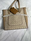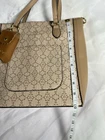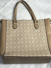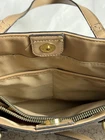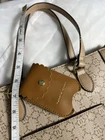 NANETTE LEPORE Tan Snap Closure Crossbody Handbag Keychain Hand sanitizer Holder Brand: Nanette Lepore Style: crossbody bucket bag Accents: detachable hand sanitizer holder, detachable strap for crossbody, hand held straps, snap closure, center pocket, interior zip pocket, two pen/ phone pockets, outer pocket Condition: preowned great small amount of wear in the interior but barely noticeable and everything intact and together Measurements: strap attached to bag 7’, depth/length 10’, width 12’