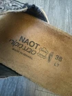 The Naot Women's Bronze Slip-On Wedge Sandal in size 7 is a stylish and comfortable option for women looking for a high-heeled sandal. With a solid bronze color and a slip-on design, these sandals feature a wedge heel and a logo accent. Made of leather with a standard shoe width, they offer both comfort and adjustable straps for a perfect fit. Perfect for adding a touch of metal-themed flair to any outfit, these sandals are a versatile addition to any wardrobe. Preowned Good Condition