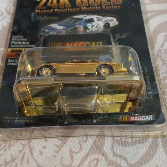Up for sale: NASCAR 24K Gold Racing Champions Series Die-Cast Race Car #32 . This collectible is new in original packaging , featuring a 24K gold-plated finish . The box has minor cosmetic indentations (see photos), but the car inside is untouched and display-ready. ✅ Product Details: Brand: Racing Champions Series: NASCAR 24K Gold Edition Model: Race Car #32 Condition: New in Box (box shows minor wear) Type: Die-cast collectible Finish: 24K gold-plated Great for: Collectors, racing fans, NASCAR memorabilia Ships securely from a smoke-free home 🏆 Rare and eye-catching addition to any serious NASCAR or die-cast collection!