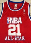 The product is a men's jersey of Tim Duncan from the San Antonio Spurs, specifically designed for the 2003 NBA All Star Game. It is a size 56 red Reebok jersey, officially licensed by the National Basketball Association (NBA). The jersey is a HWC Swingman model, suitable for basketball fans wanting to represent one of the greatest players in NBA history. Has some marks. Check pictures for condition and measurements for size.