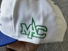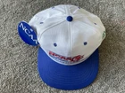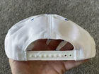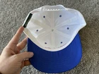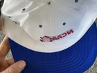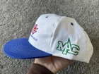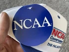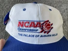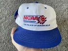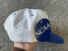 The product is a vintage 90s NCAA Championship hat cap in white and blue, featuring a snap back design. It is officially licensed for the NCAA Championship and is designed for men. The hat is one size fits all and is suitable for basketball fans looking to support their team during March Madness. This Sahara Headgear item was made in the United States and is a nostalgic piece perfect for collectors or fans of college basketball.