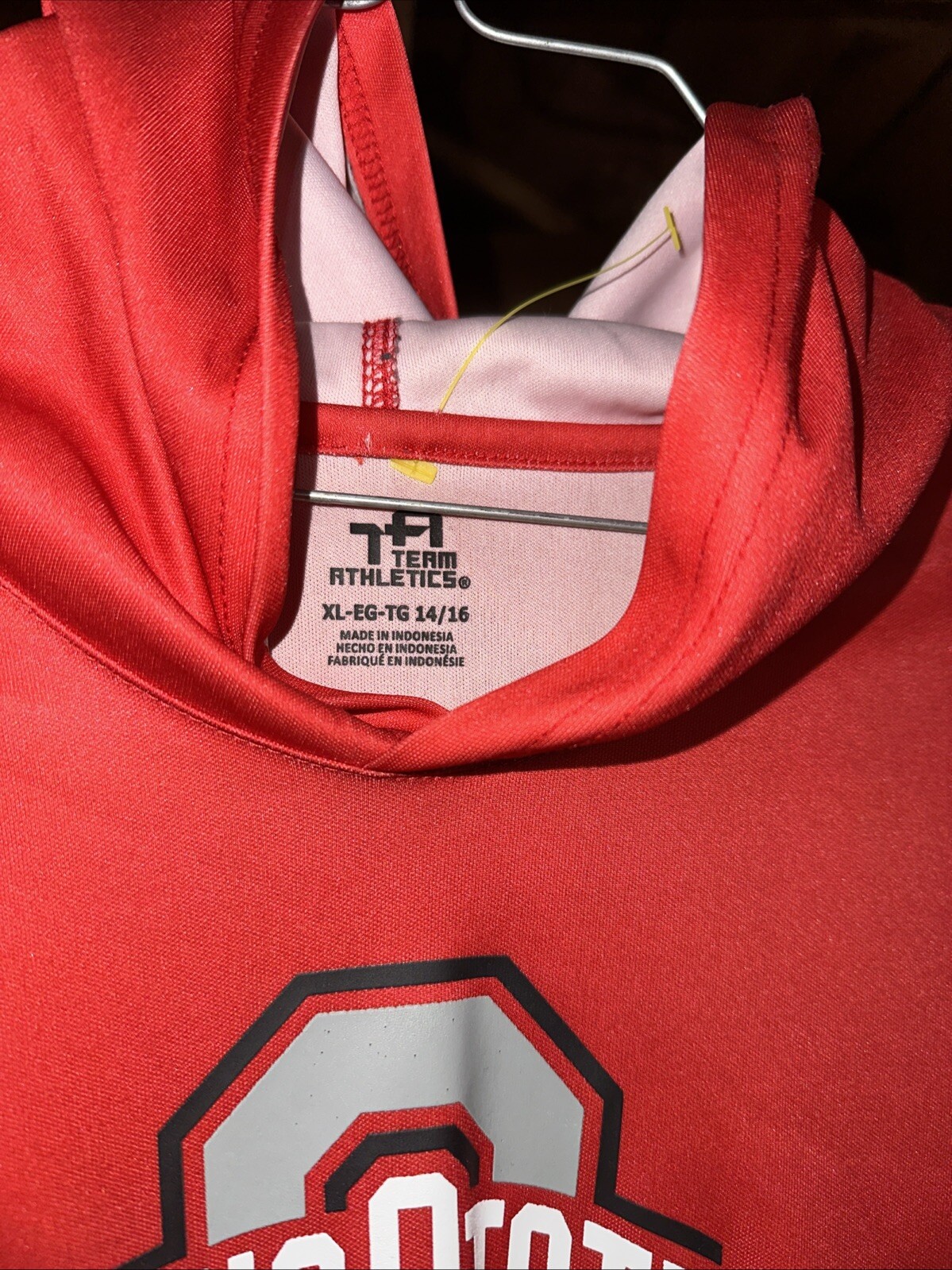 The product is an Ohio State Buckeyes youth lightweight hooded windbreaker in size XL (14-16), designed for unisex children. It features the team's branding and comes in a vibrant red color. Perfect for young fans looking to show their support for the Ohio State Buckeyes, this hoodie is ideal for wearing during outdoor activities or to stay warm during cooler weather. The windbreaker design adds practicality by providing protection against wind and light rain, making it a versatile and stylish addition to any young fan's wardrobe.