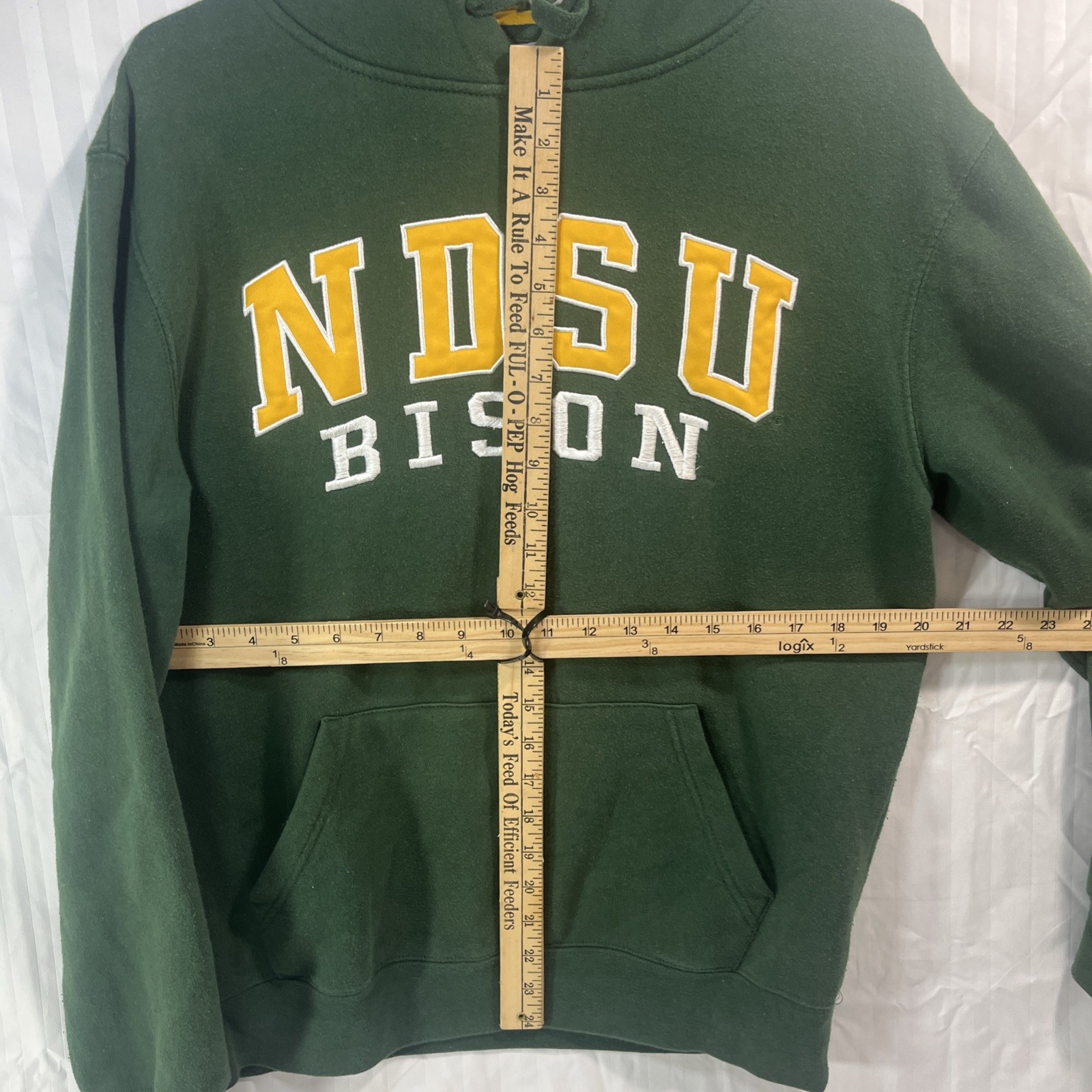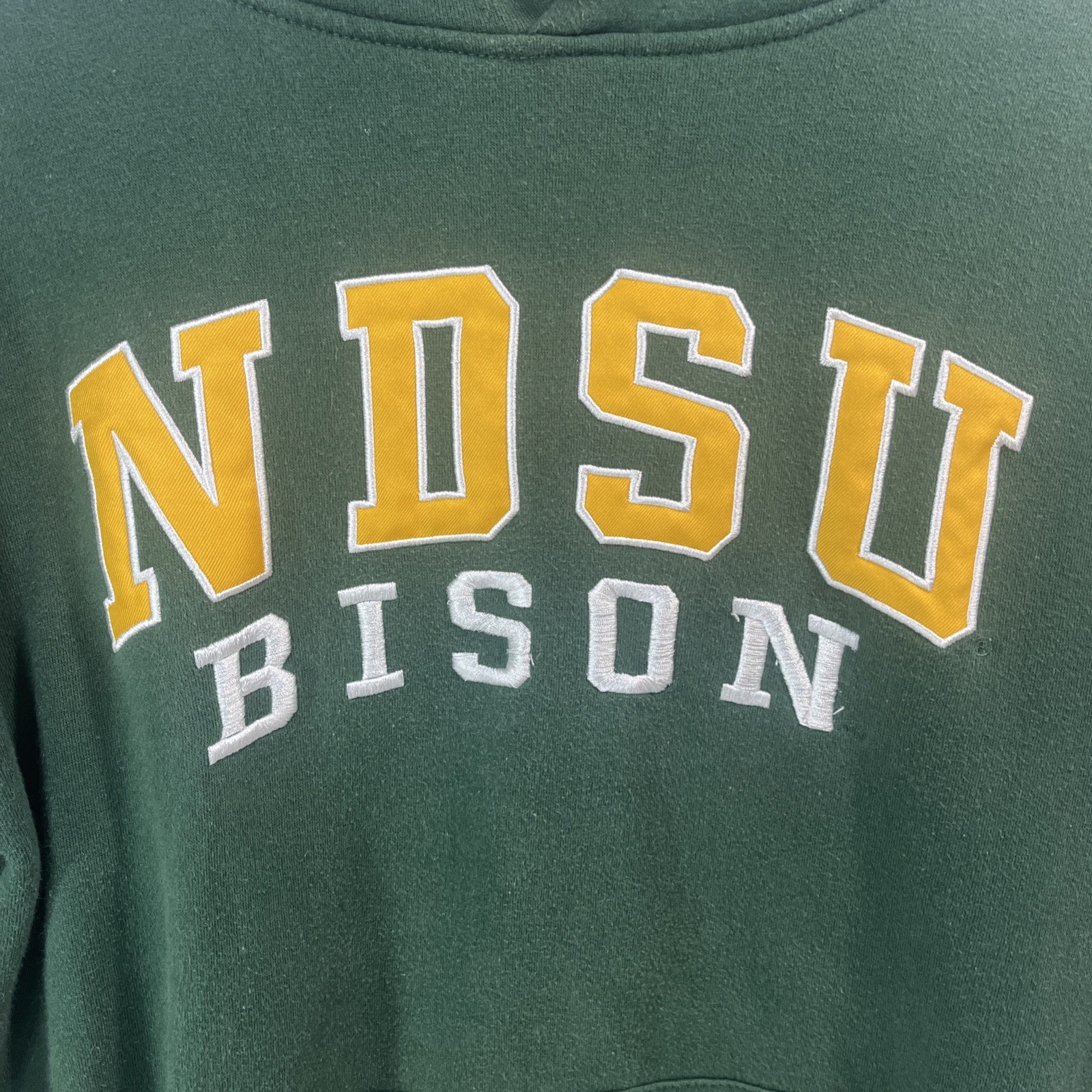 The NDSU Bison Hoodie by Stadium Athletics is a medium-sized green pullover hoodie featuring the North Dakota State University logo embroidered on the front. This hoodie is designed for athletic fit and includes a hood and pockets for added convenience. Perfect for fans of the Bison or anyone looking for a stylish and comfortable hooded sweatshirt to show support for their favorite team or university.