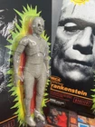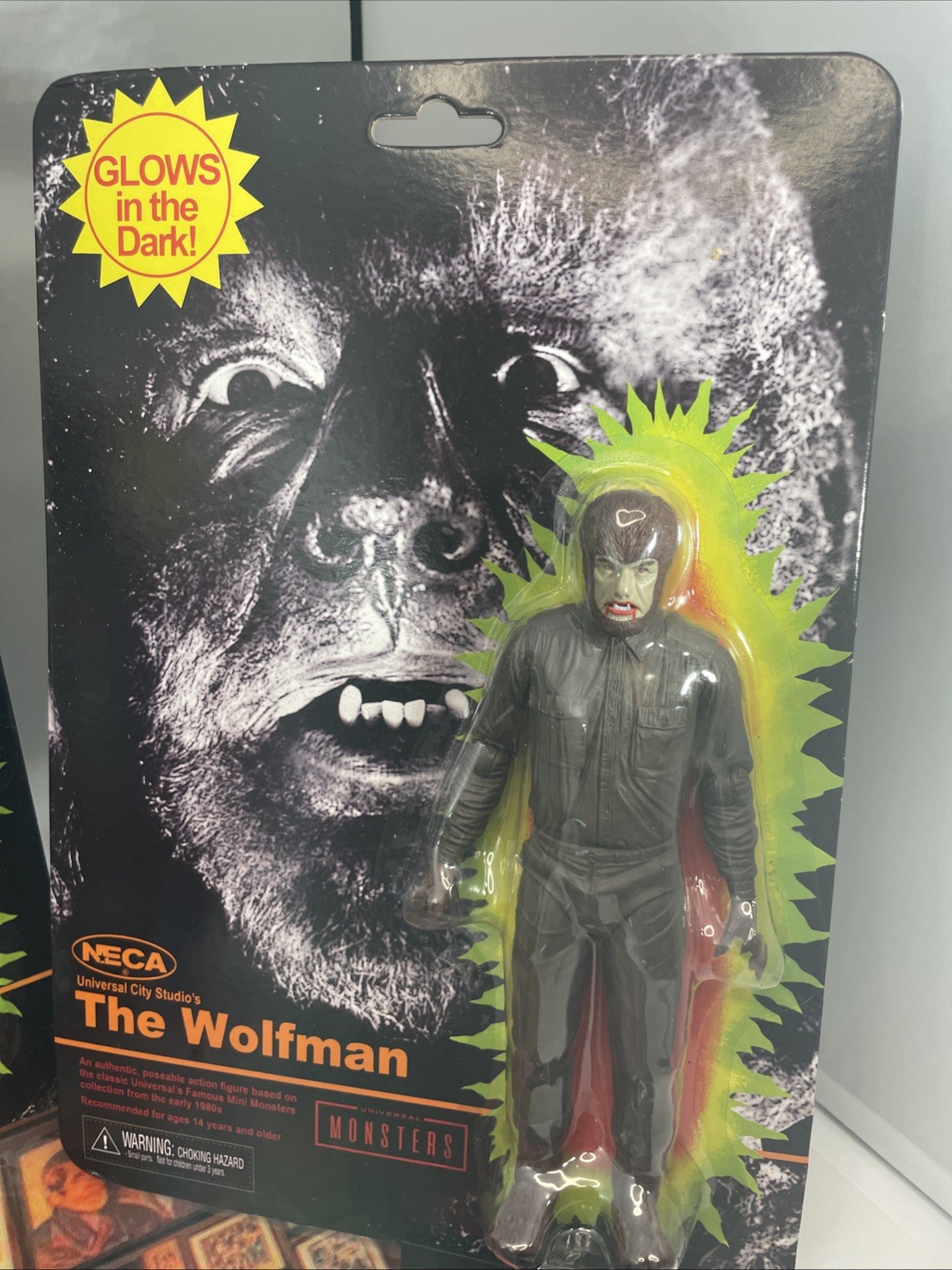 NECA 2022 Glow in the Dark Universal Monsters action figures. These figures are retro-style and come on blister cards with artwork reminiscent of the classic monster movie posters. The set includes: The Mummy: This figure is wrapped in bandages and has a glow-in-the-dark feature that makes it luminescent in low-light conditions. Frankenstein's Monster: This figure depicts the iconic monster with green skin and bolts in his neck, also featuring a glow-in-the-dark effect. The Wolfman: This figure portrays the werewolf with a hairy body and a menacing expression, and it also glows in the dark. These figures are part of NECA's retro line, which pays homage to the classic Universal Monsters films. They are designed with a vintage aesthetic and have a glow-in-the-dark feature that adds to their appeal. The figures are approximately 7 inches tall and are articulated, allowing for posing and display. The blister card packaging adds to the collectible nature of these figures, making them popular among fans of classic horror movies and toy collectors. Capture the essence of classic horror with this NECA 2022 Glow In The Dark Universal Monsters lot, featuring three iconic characters: Frankenstein's Monster, The Wolfman, and The Mummy. Each action figure in this set is meticulously crafted, staying true to the original Universal Studios series. With their dark-themed glow-in-the-dark feature, these figures bring a haunting ambiance to any collection. This mixed lot is a must-have for fans of horror movies and action figure collectors alike. The figures, representing the apex of the NECA brand, were manufactured in 2022 and are original licensed reproductions, ensuring high quality and authenticity. Add these chilling figures to your display and let the terror begin.
