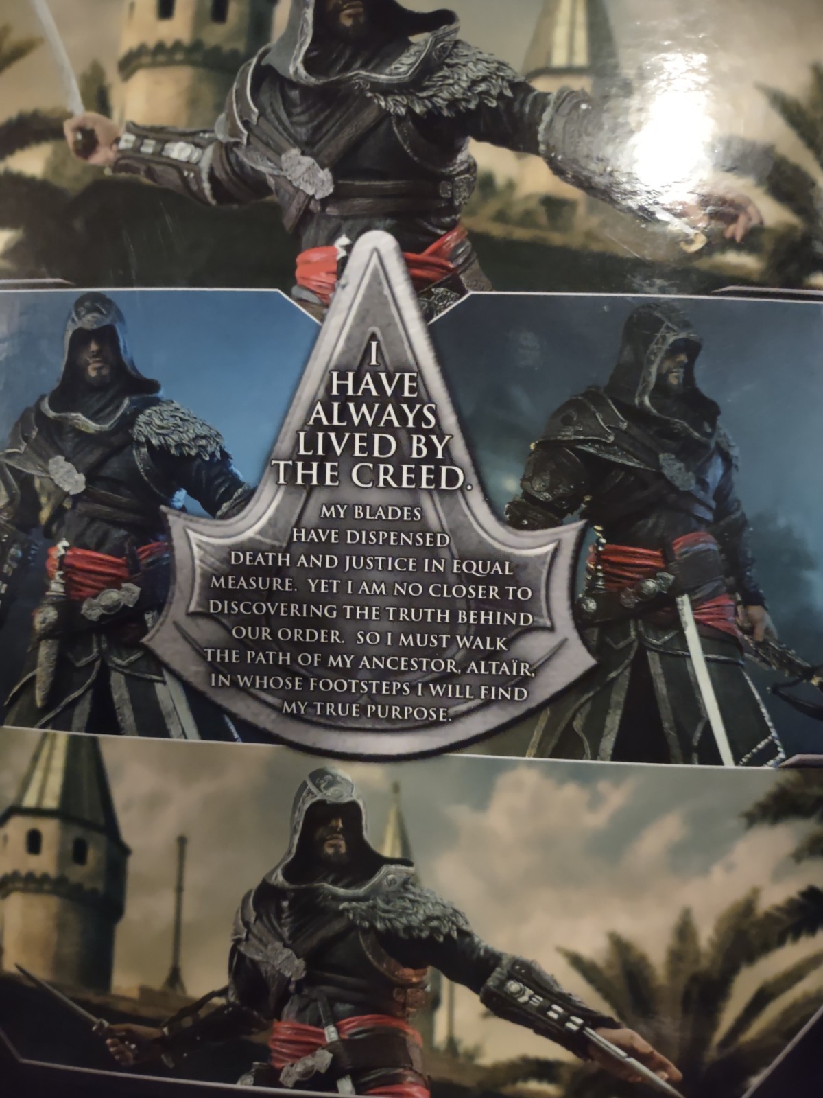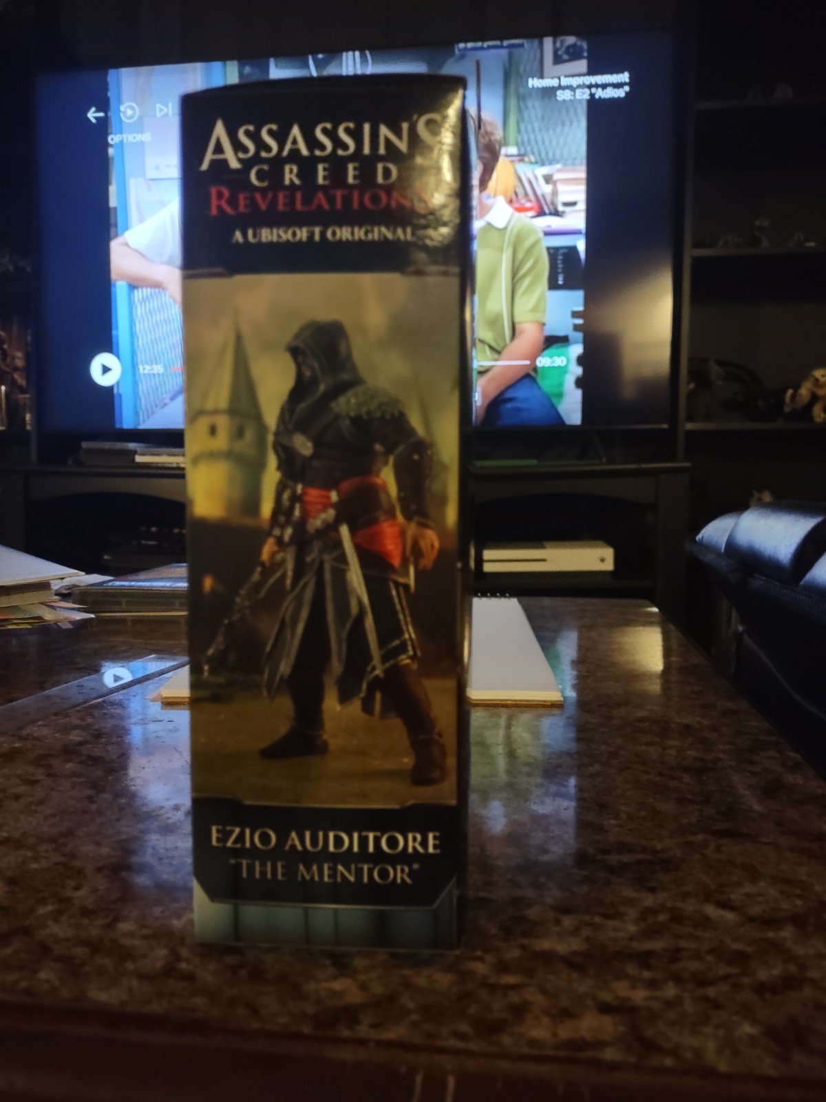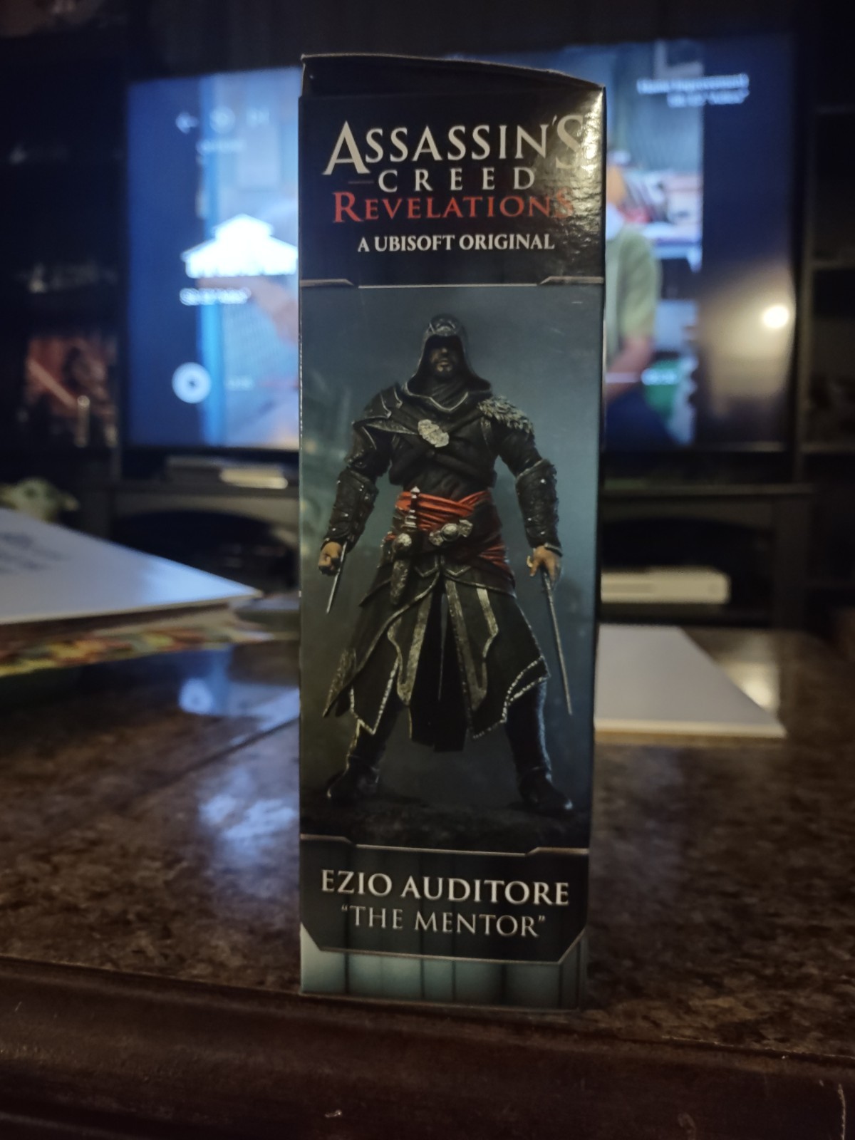 NECA's Assassin's Creed Revelations 7" Ezio Auditore "The Mentor" statue. comes with original packaging, Constantinople backdrop, replacement hands for added posing pleasure, long sword, short sword, crossbow and bolt, and two hidden blades.