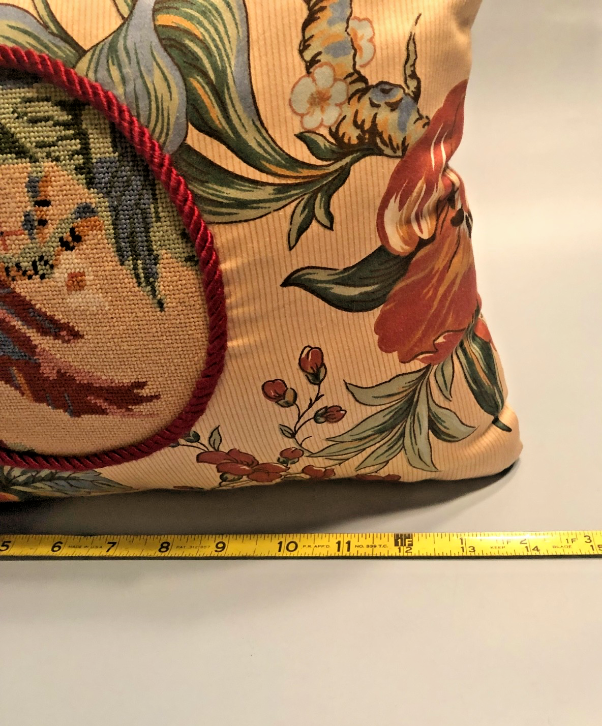 This NEEDLEPOINT Floral Bird Pillow is a unique custom piece with a country French style. Measuring 10x14 inches, the rectangular pillow features a floral pattern with embroidered birds, adding a charming touch to any home decor. Made of 100% cotton, this needlepoint pillow is perfect for adding a touch of rustic elegance to your living space. Crafted in the United States, this multicolor pillow is sure to be a standout piece in your home.
