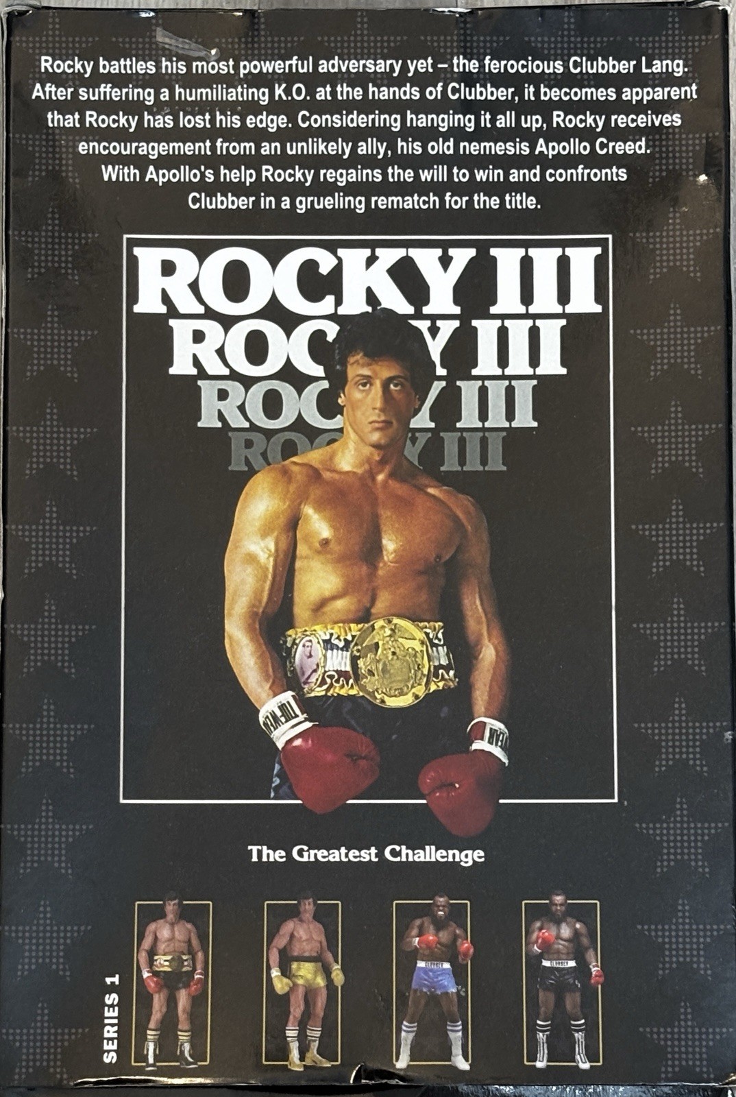 The NECA Rocky III 40th Anniversary Series 1 Rocky Balboa Action Figure commemorates the iconic film with a highly detailed 7-inch collectible. Featuring Rocky in his golden trunks, this figure captures the likeness of Sylvester Stallone with remarkable accuracy. It boasts over 20 points of articulation, allowing for dynamic posing, and includes a championship belt accessory. Packaged in a special window box, this figure is a must-have for fans and collectors celebrating four decades of the Rocky legacy